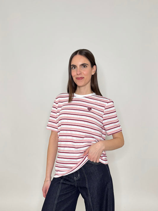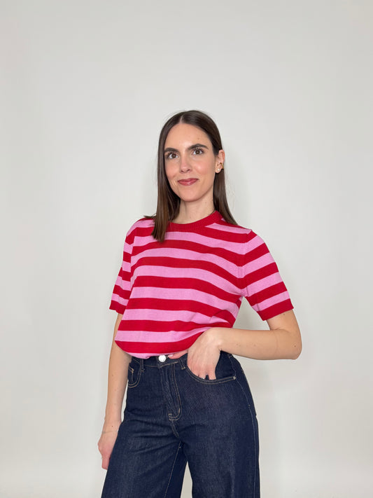 Maglia girocollo a righe manica corta in 100% cotone Fragola/Confetto - IN RISSORTIMENTO