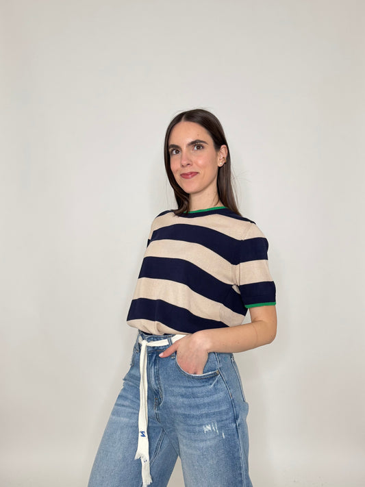 Maglia girocollo a righe manica corta in 100% cotone Blu/Beige