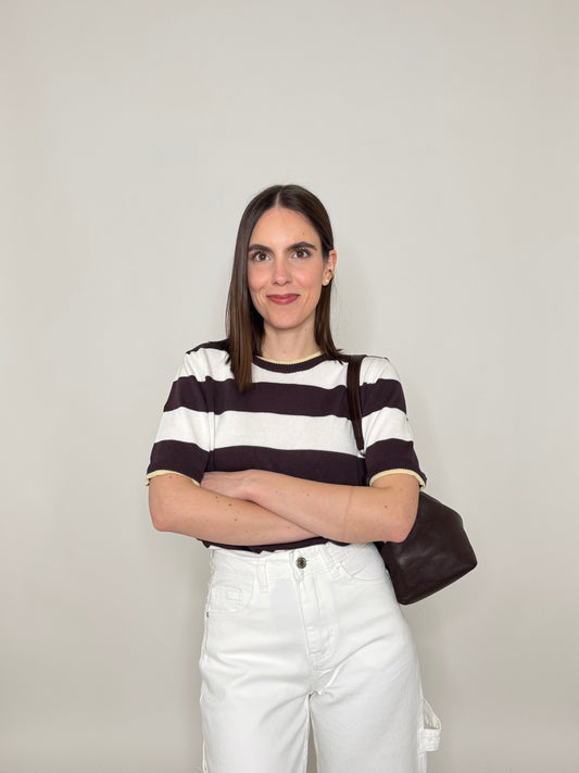 Maglia girocollo a righe manica corta in 100% cotone Moro/Panna
