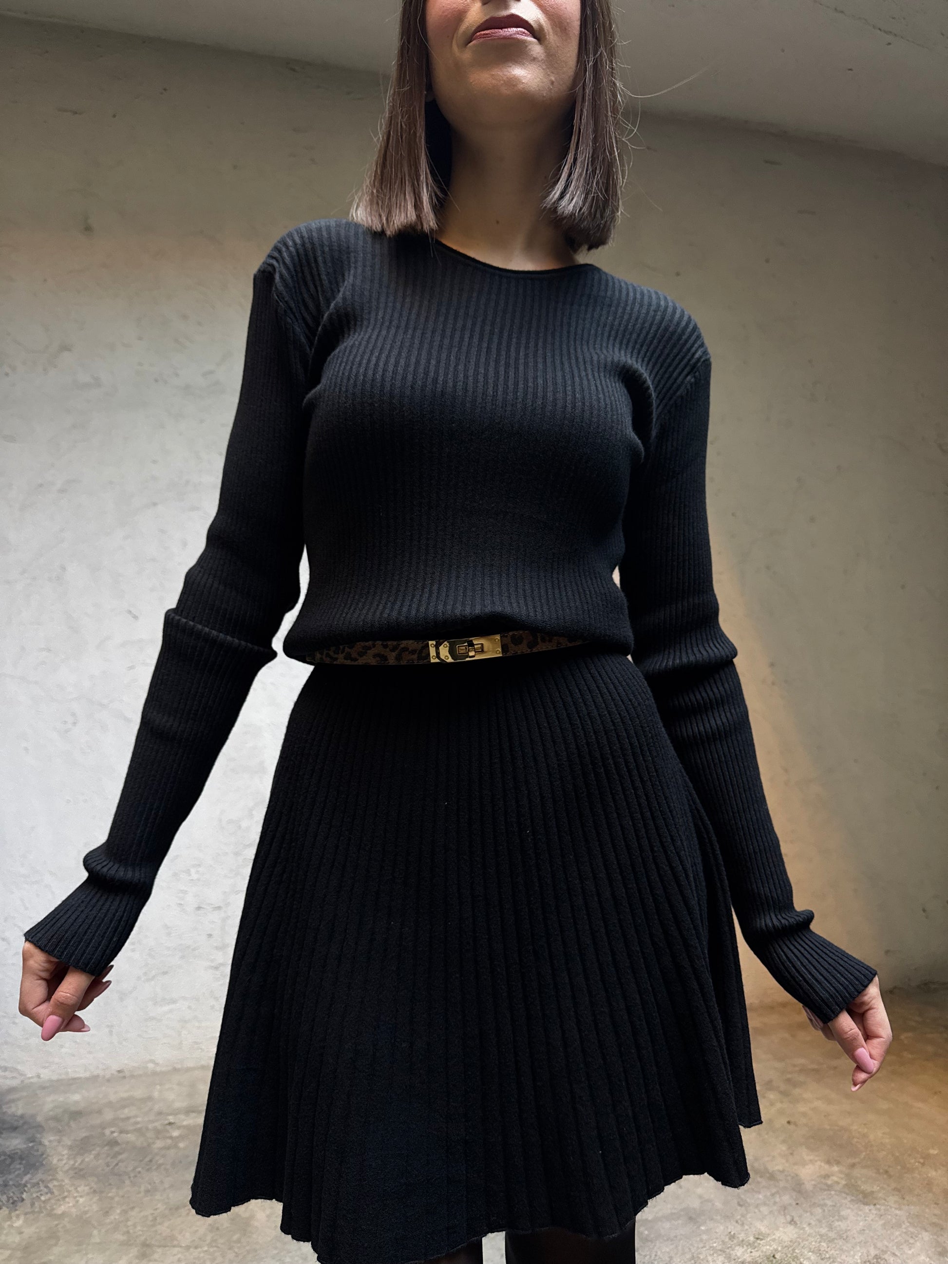 Abito super versatile in maglia di viscosa, svasato a costine. Girocollo.