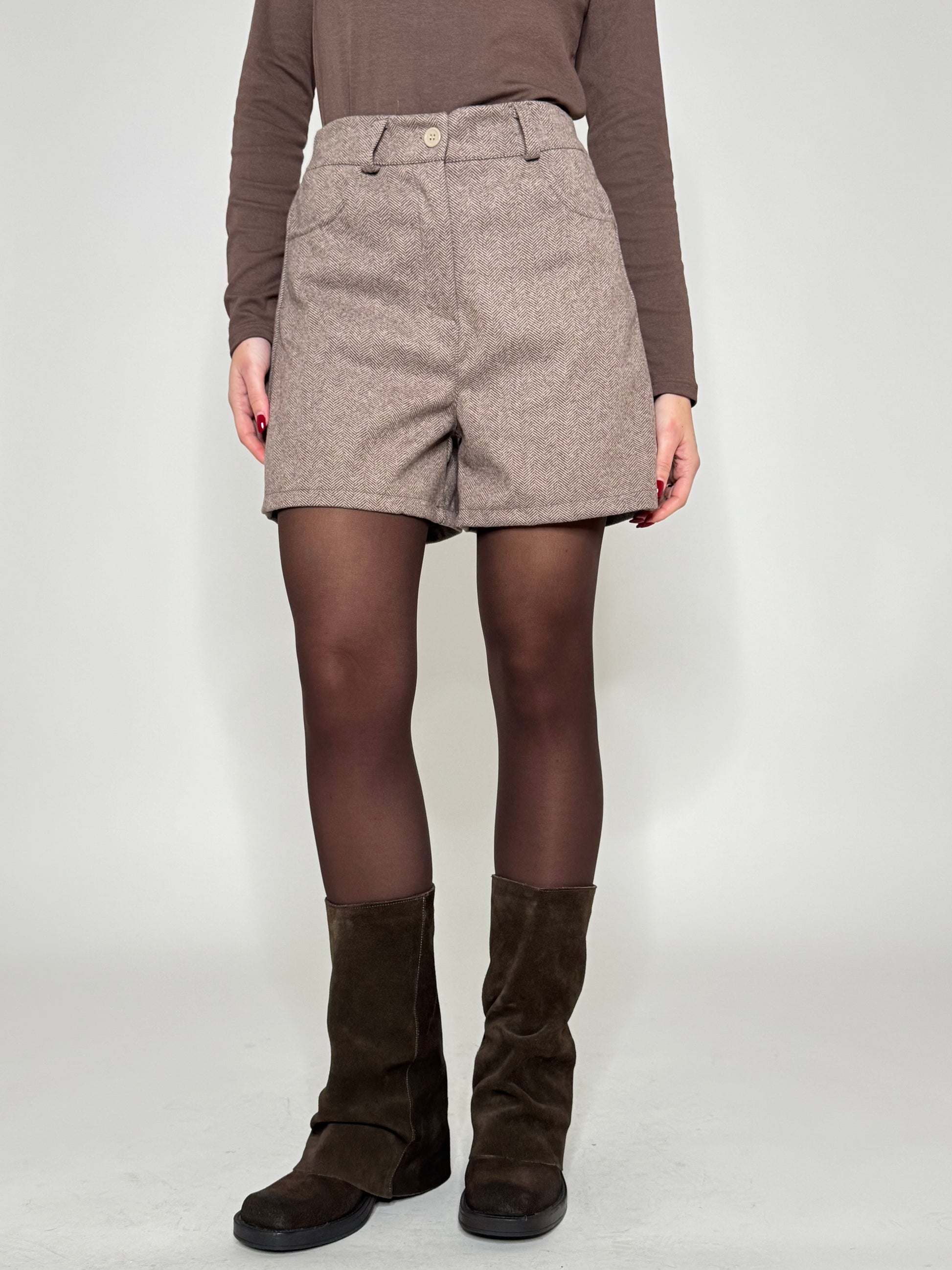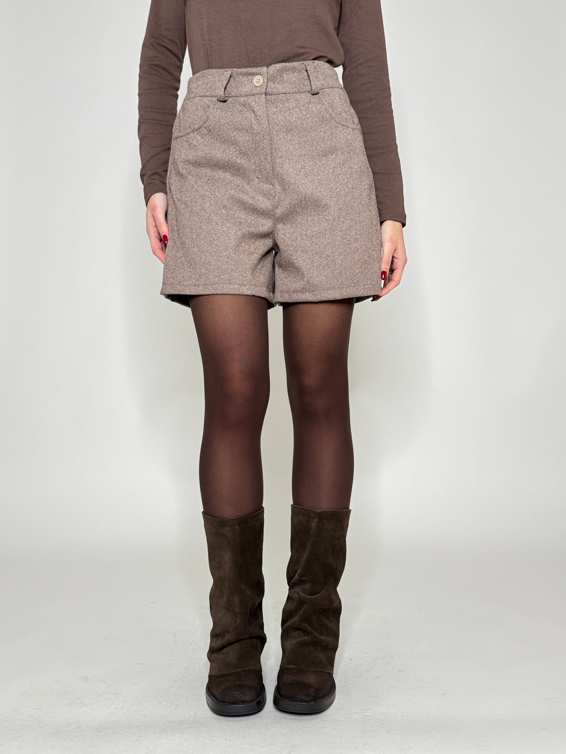 Bermuda morbido, spigato, elastico sul retro, tasche, bottone e zip, passanti per eventuale cintura.