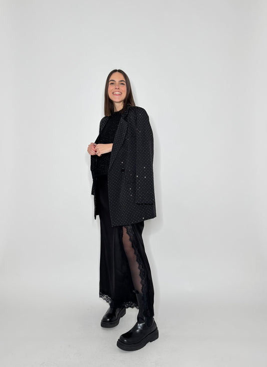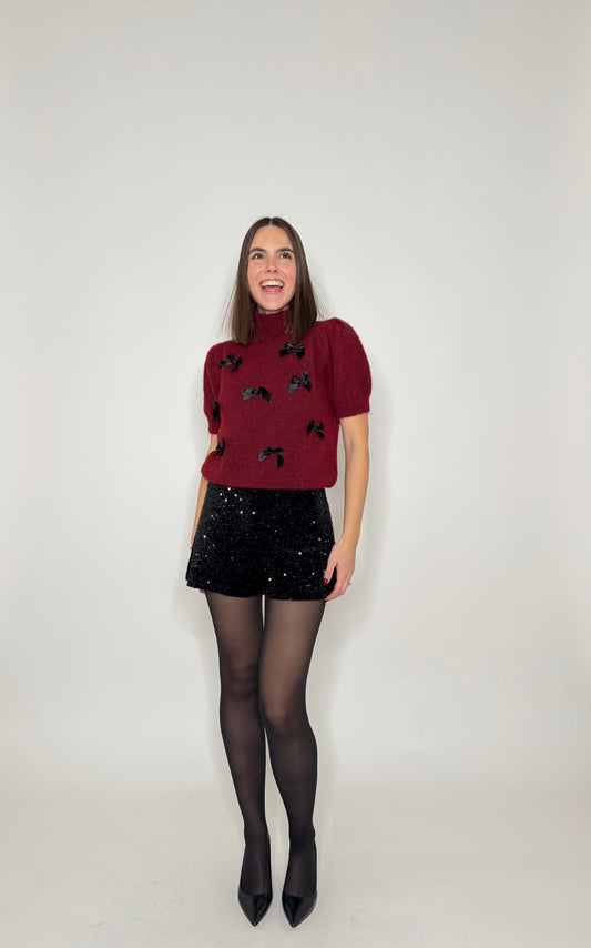 Maglia taglio laser mezzo collo in misto viscosa strass Nero