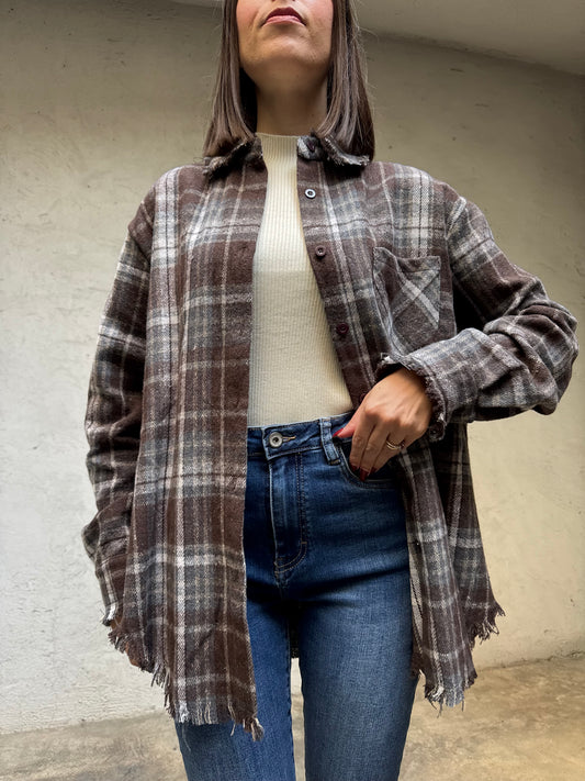 Camicia Sfrangiata flanella stampa check cioccolato/grigio