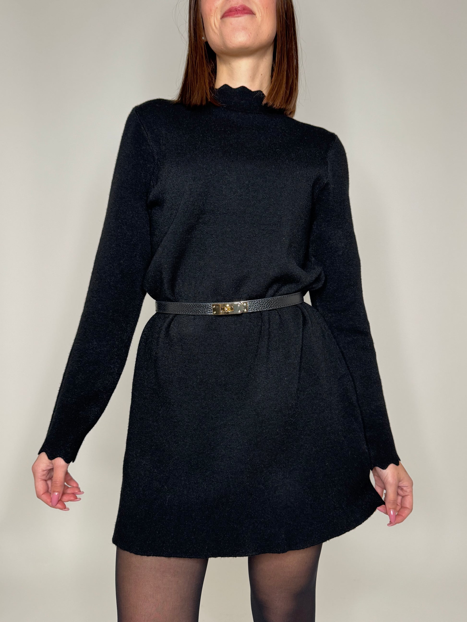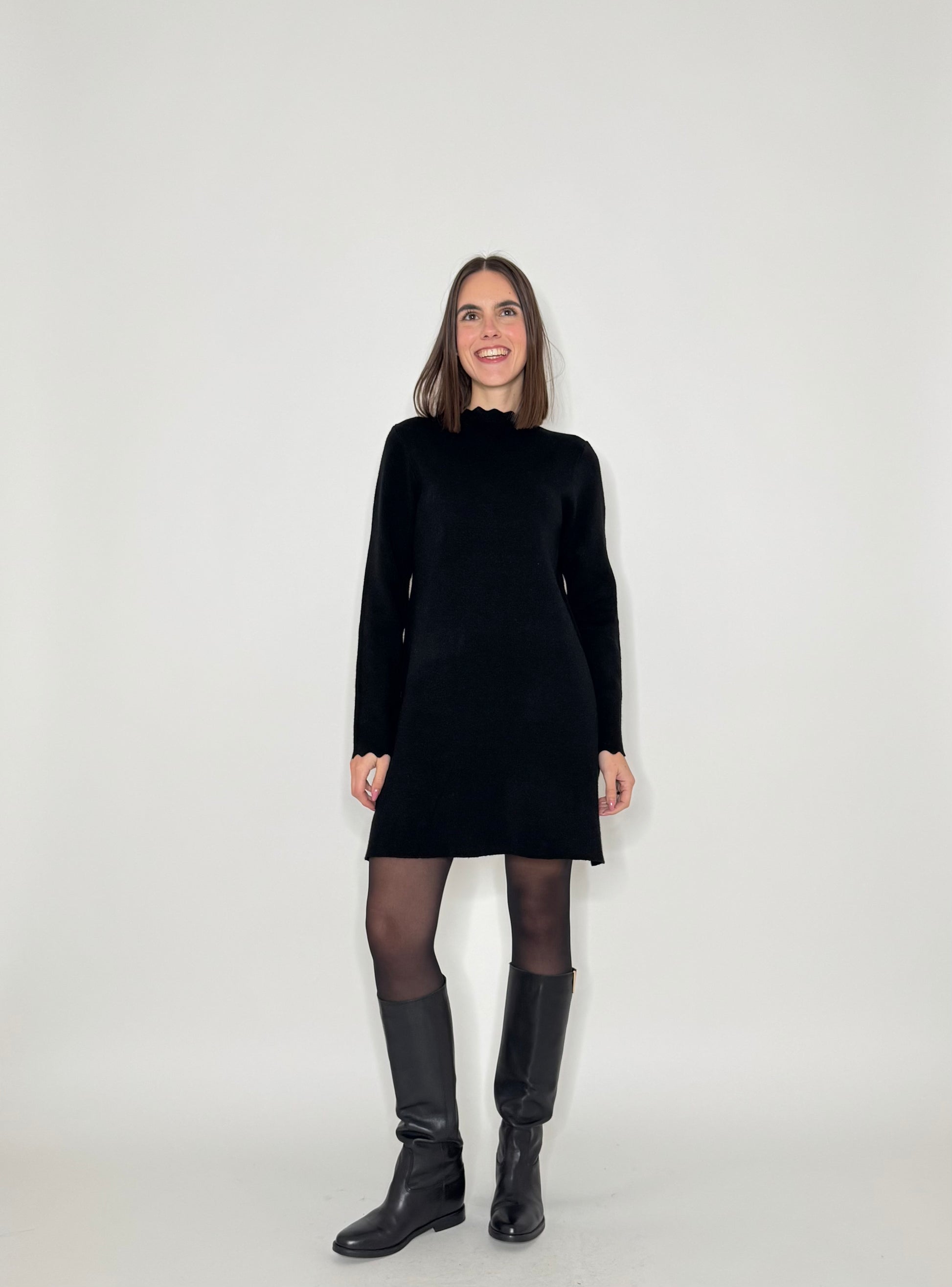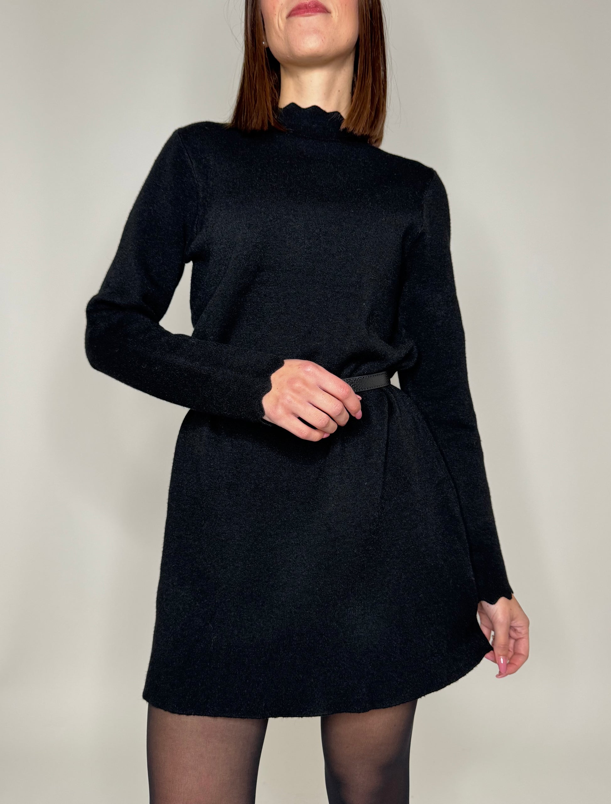 Abito in calda viscosa, modello trapezio, dettagli di zigzag su scollo e maniche.