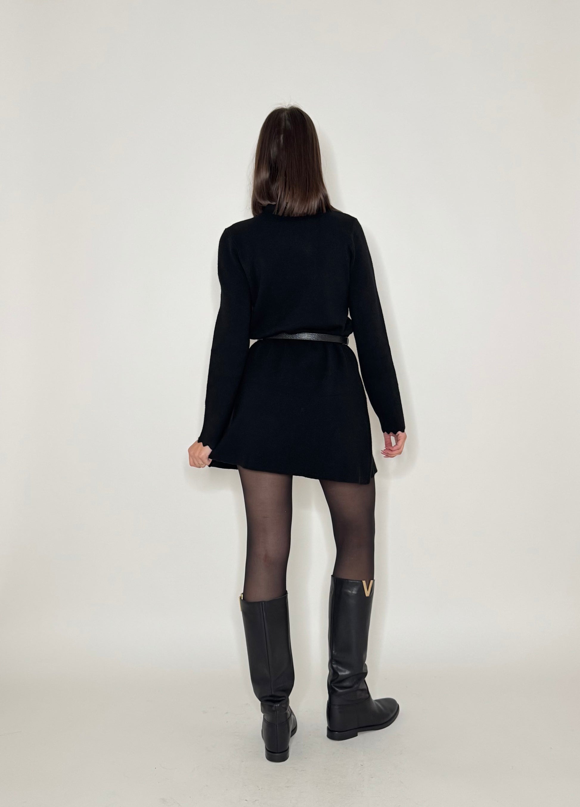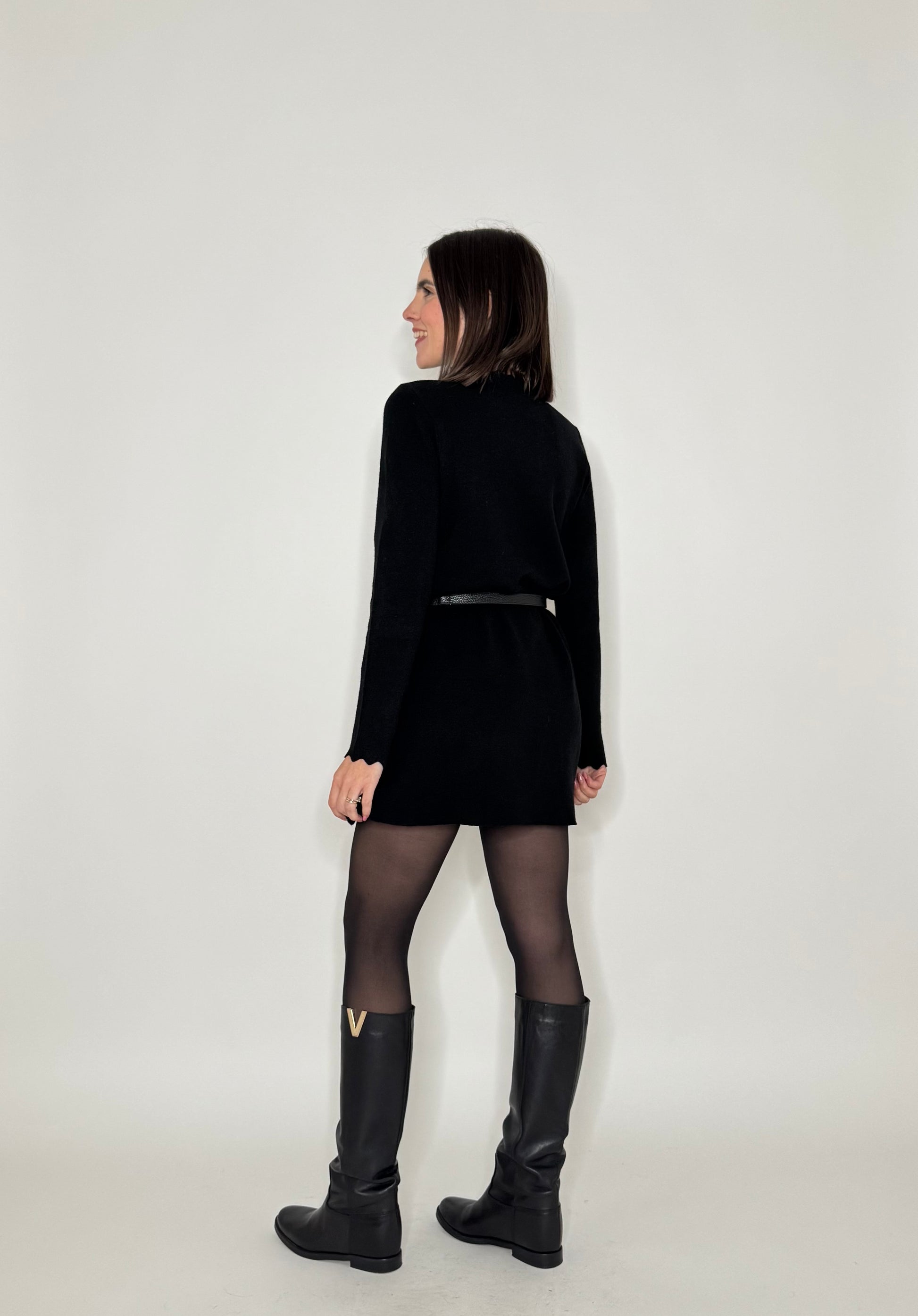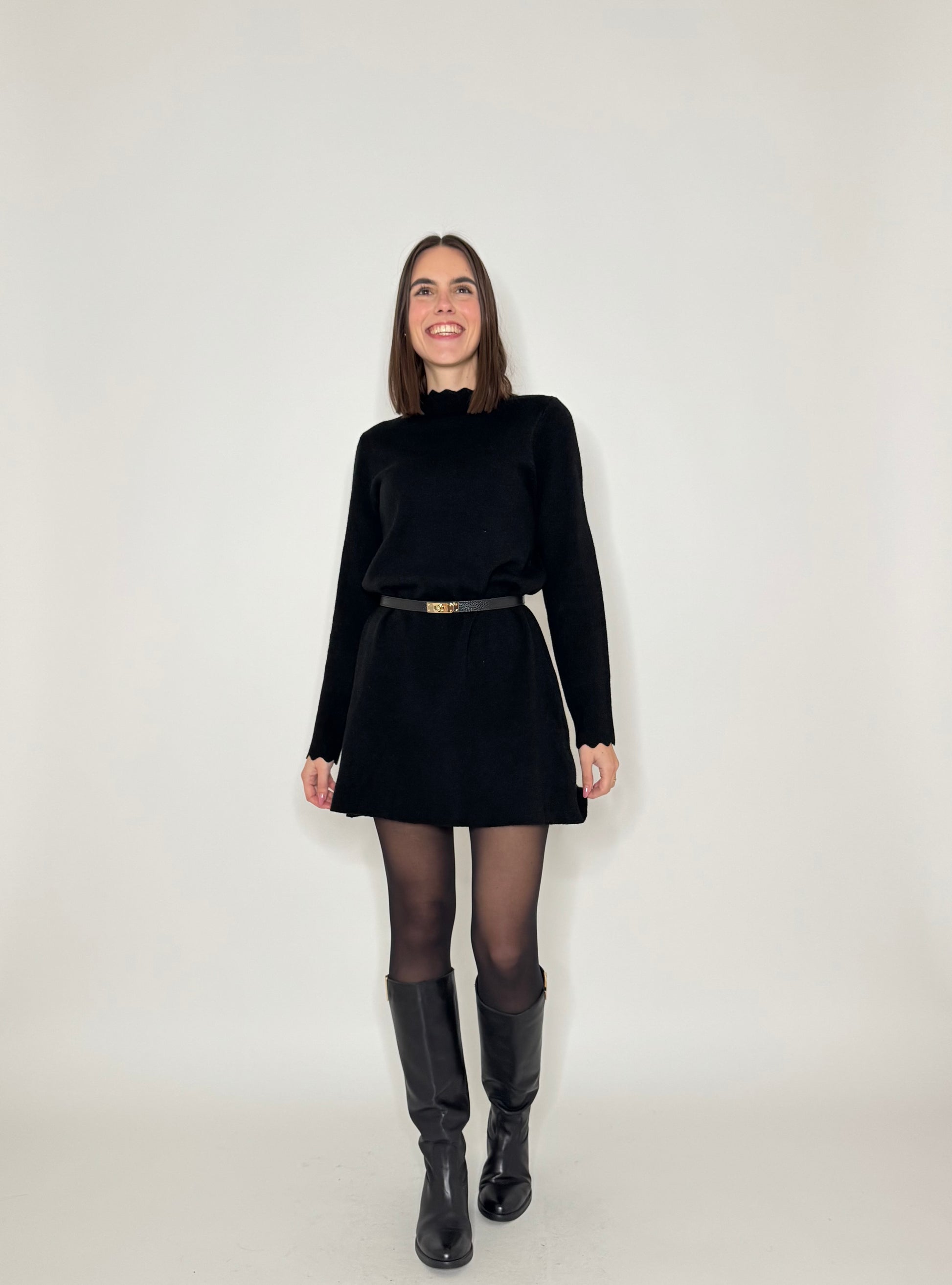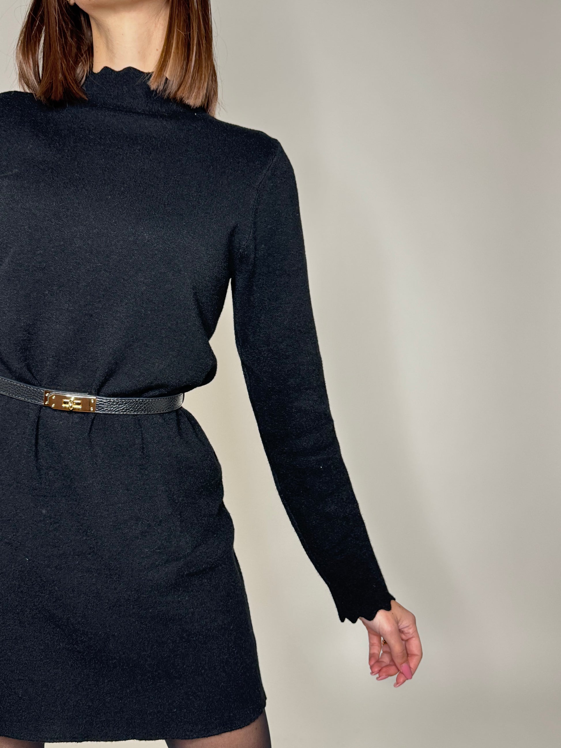 Abito in calda viscosa, modello trapezio, dettagli di zigzag su scollo e maniche.