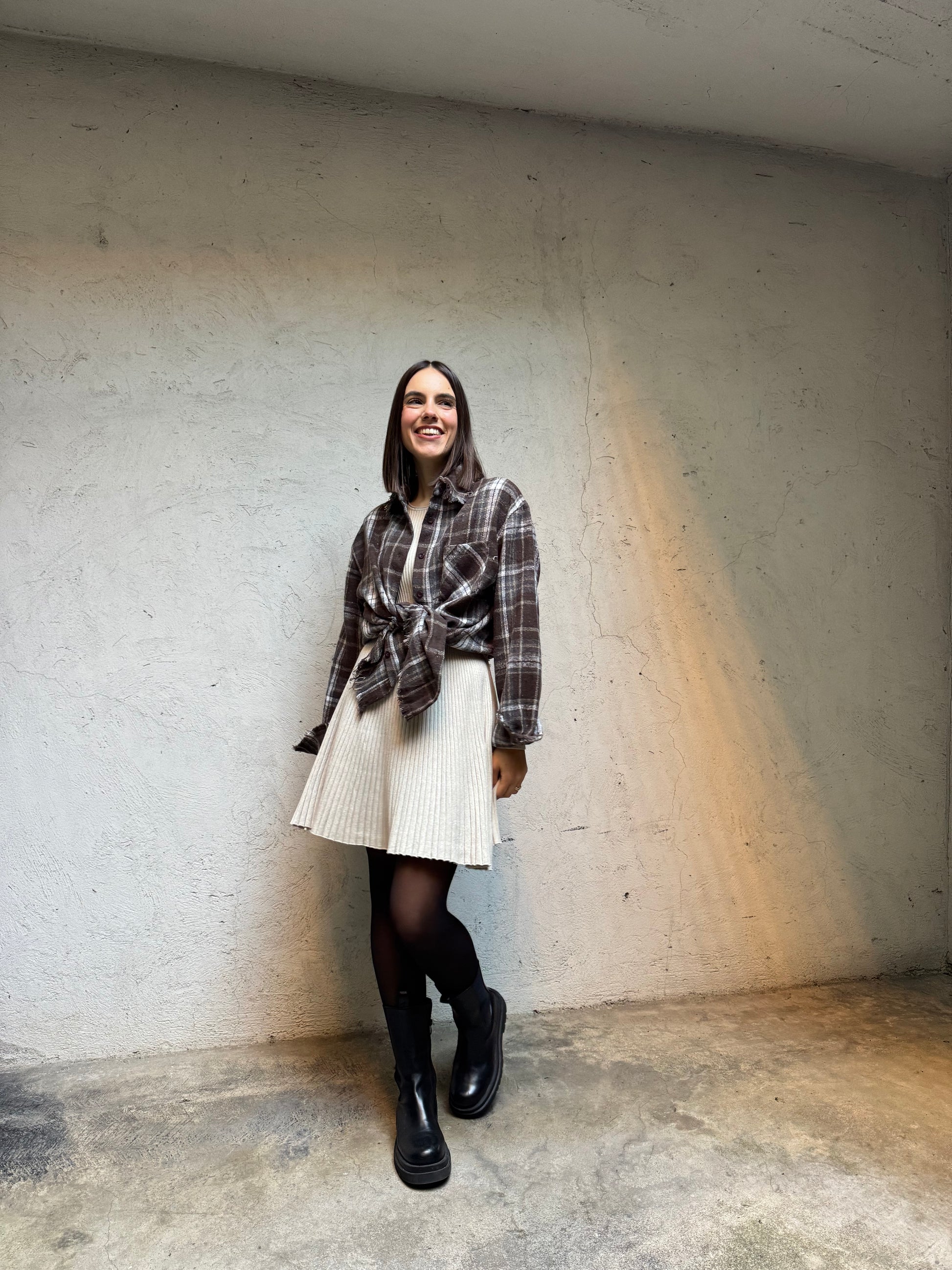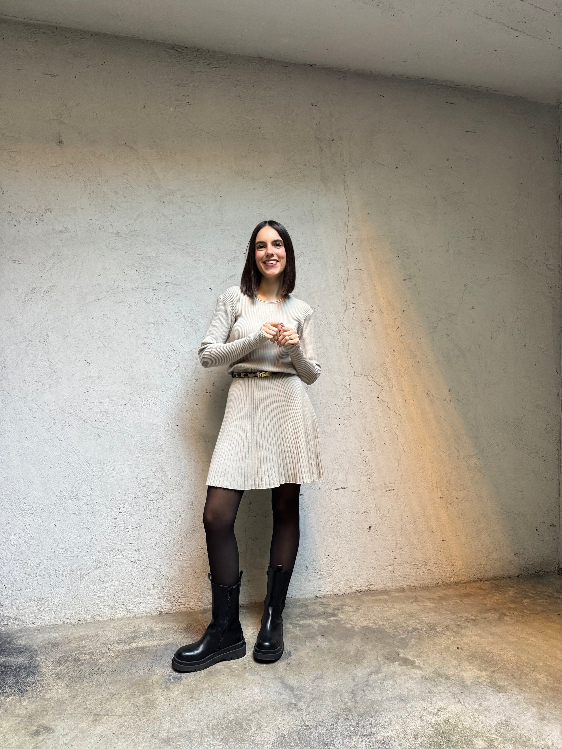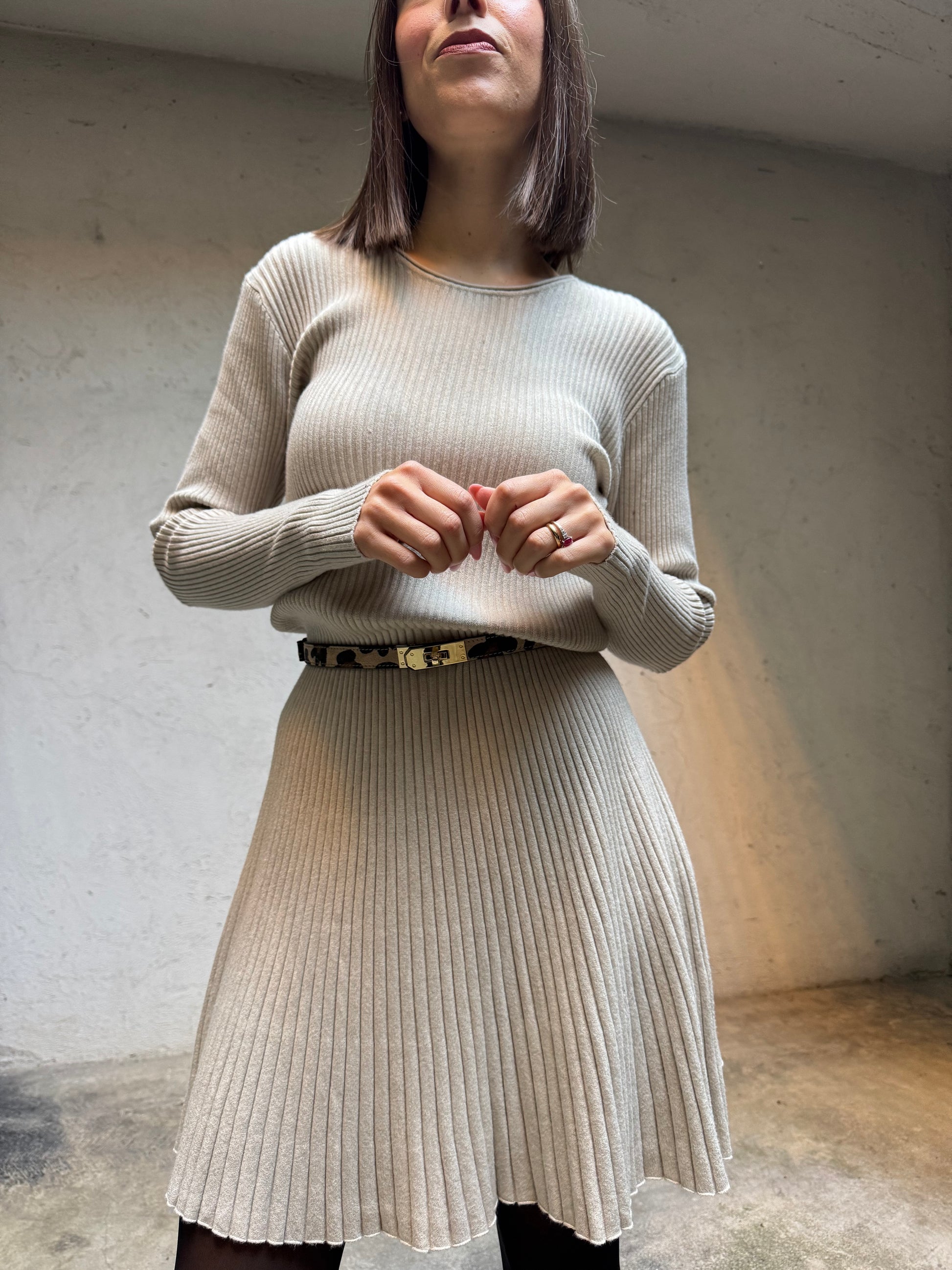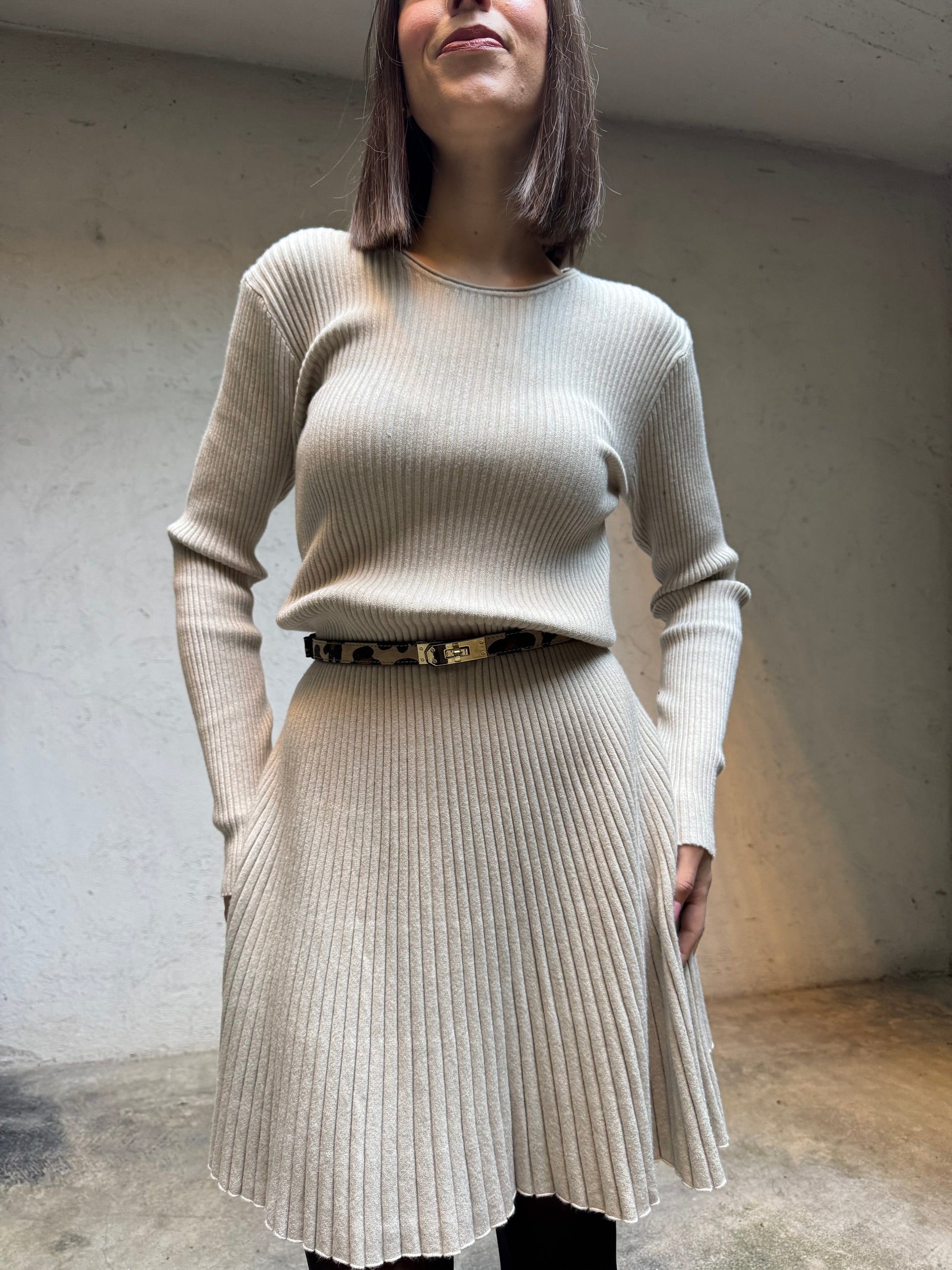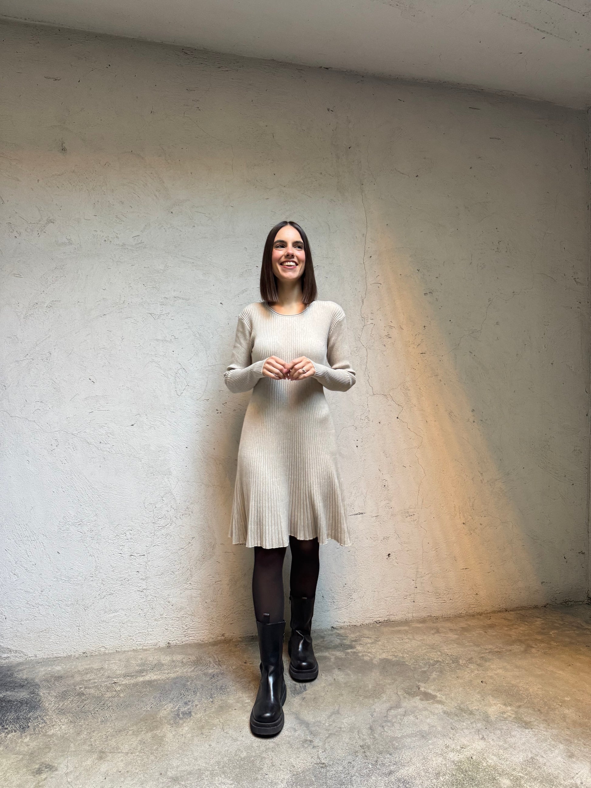 Abito super versatile in maglia di viscosa, svasato a costine. Girocollo.