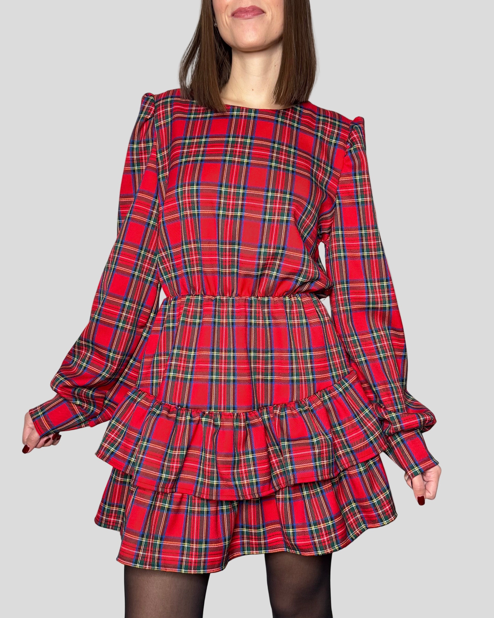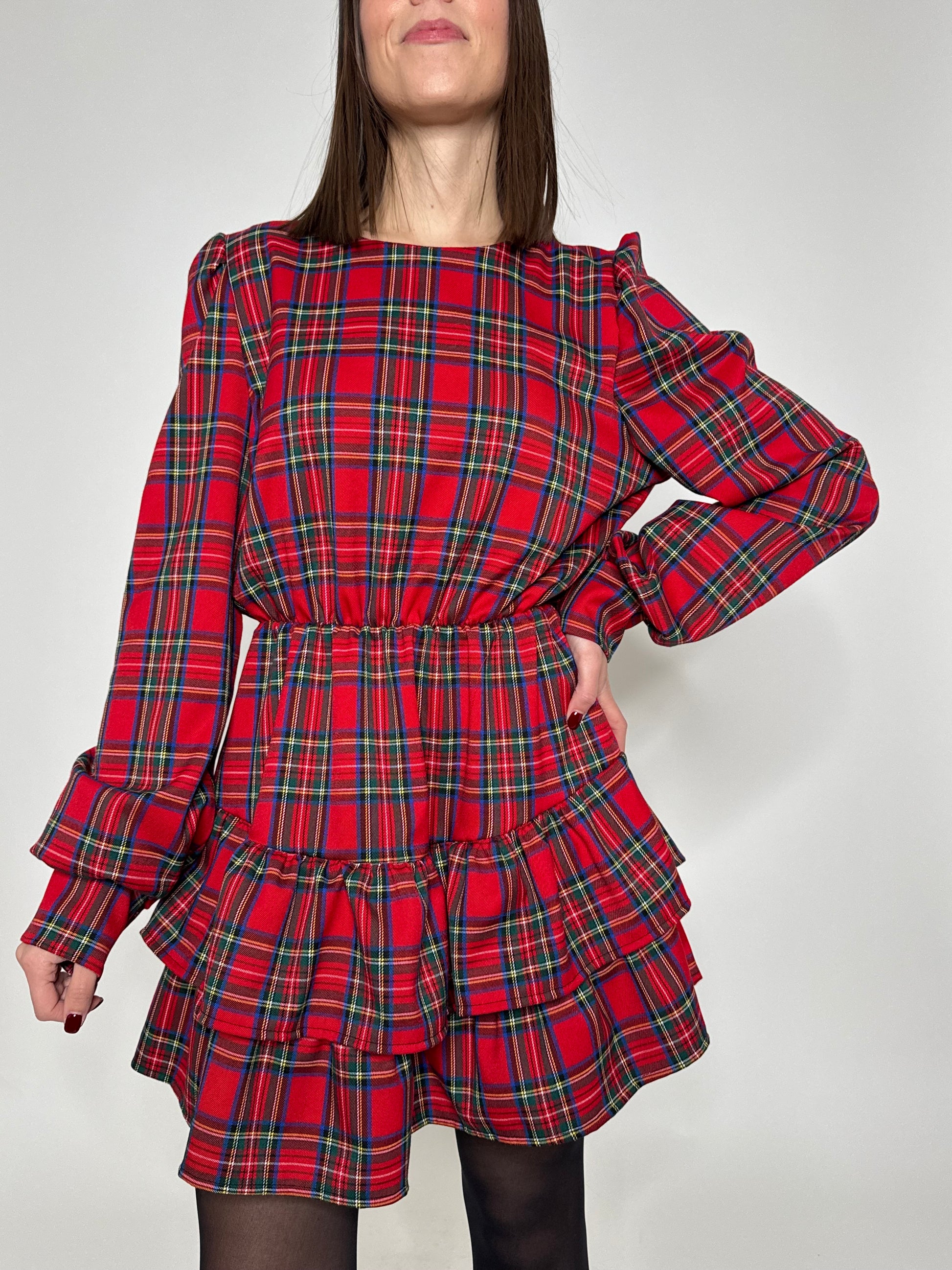 Abito svolazzante in tartan rosso, manica lunga, punto vita con elastico, bottoncino di chiusura sul retro in argento.