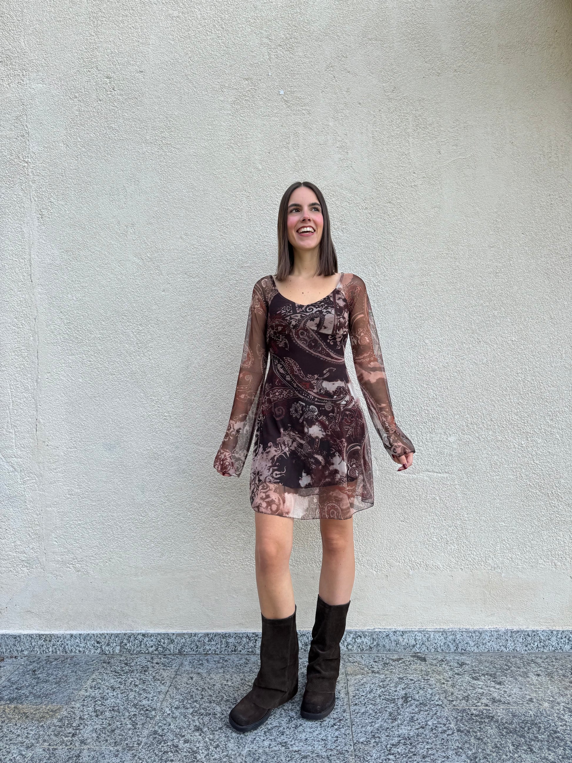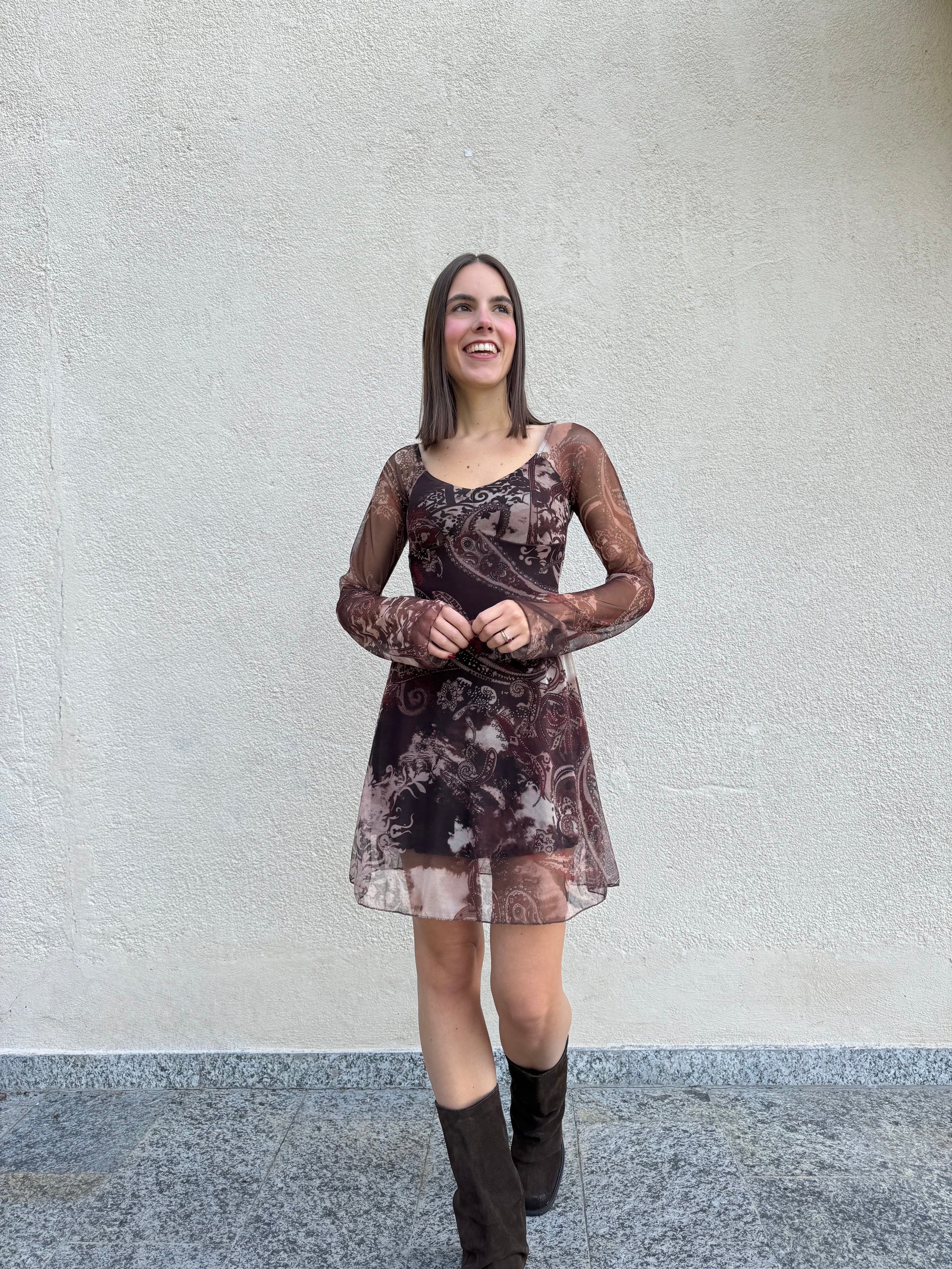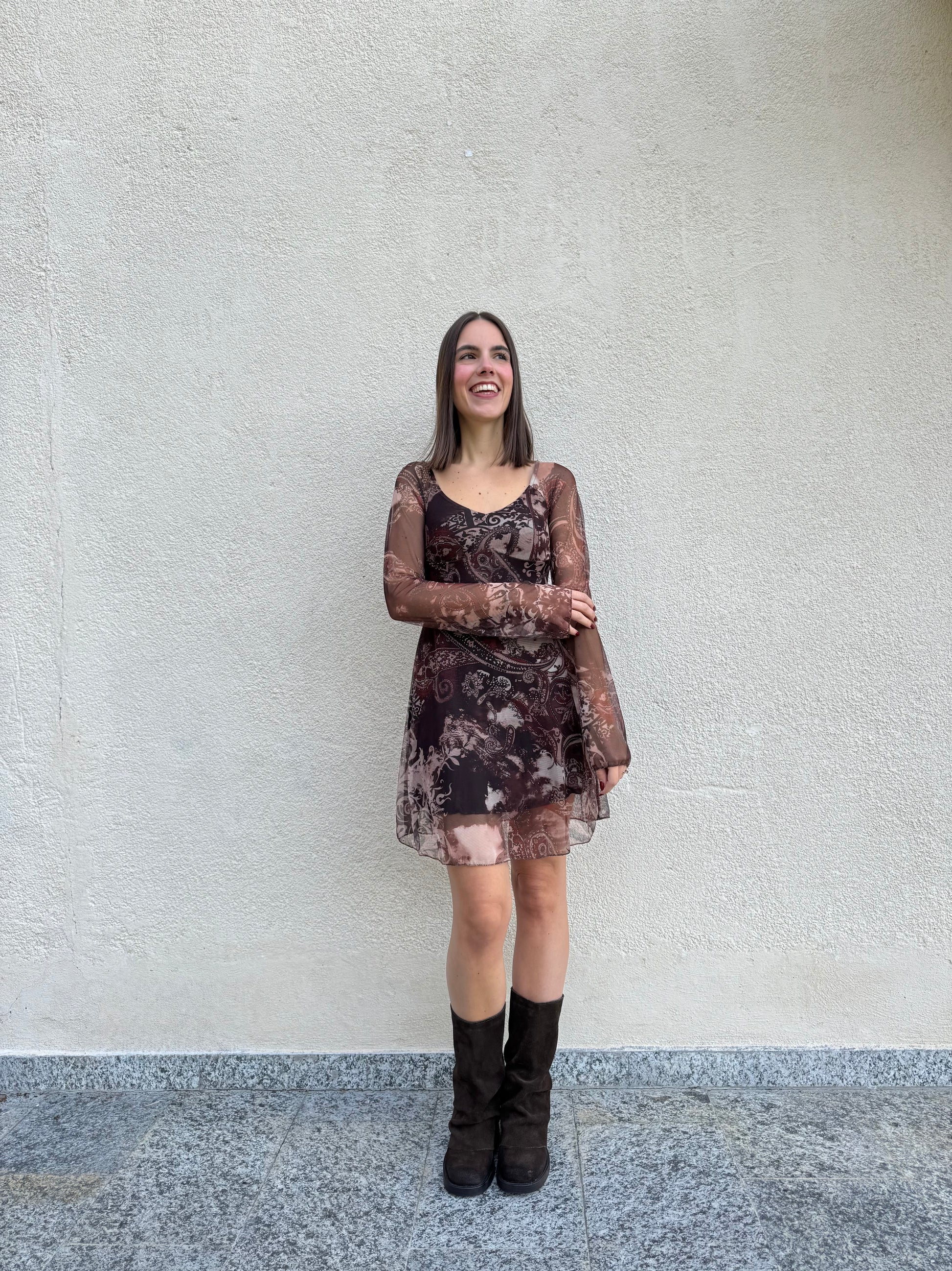 Abito in tulle con scollo a cuore, foderato. Corpino aderente e gonne morbide. Manica lunga.