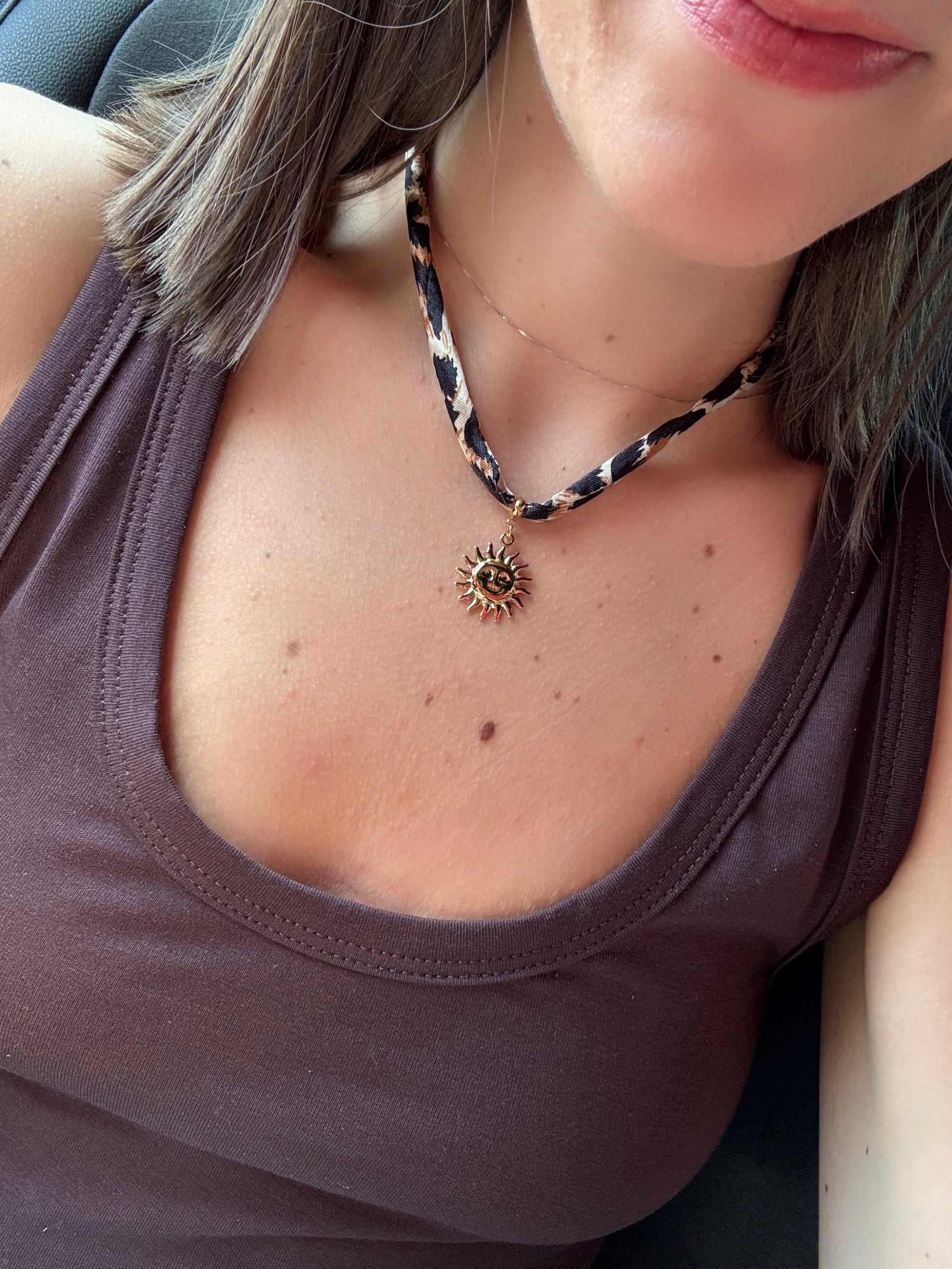 La collana é un delicato foulard, il ciondolo un carinissimo sole. Un accessorio che non fa passare inosservati per la sua originalità