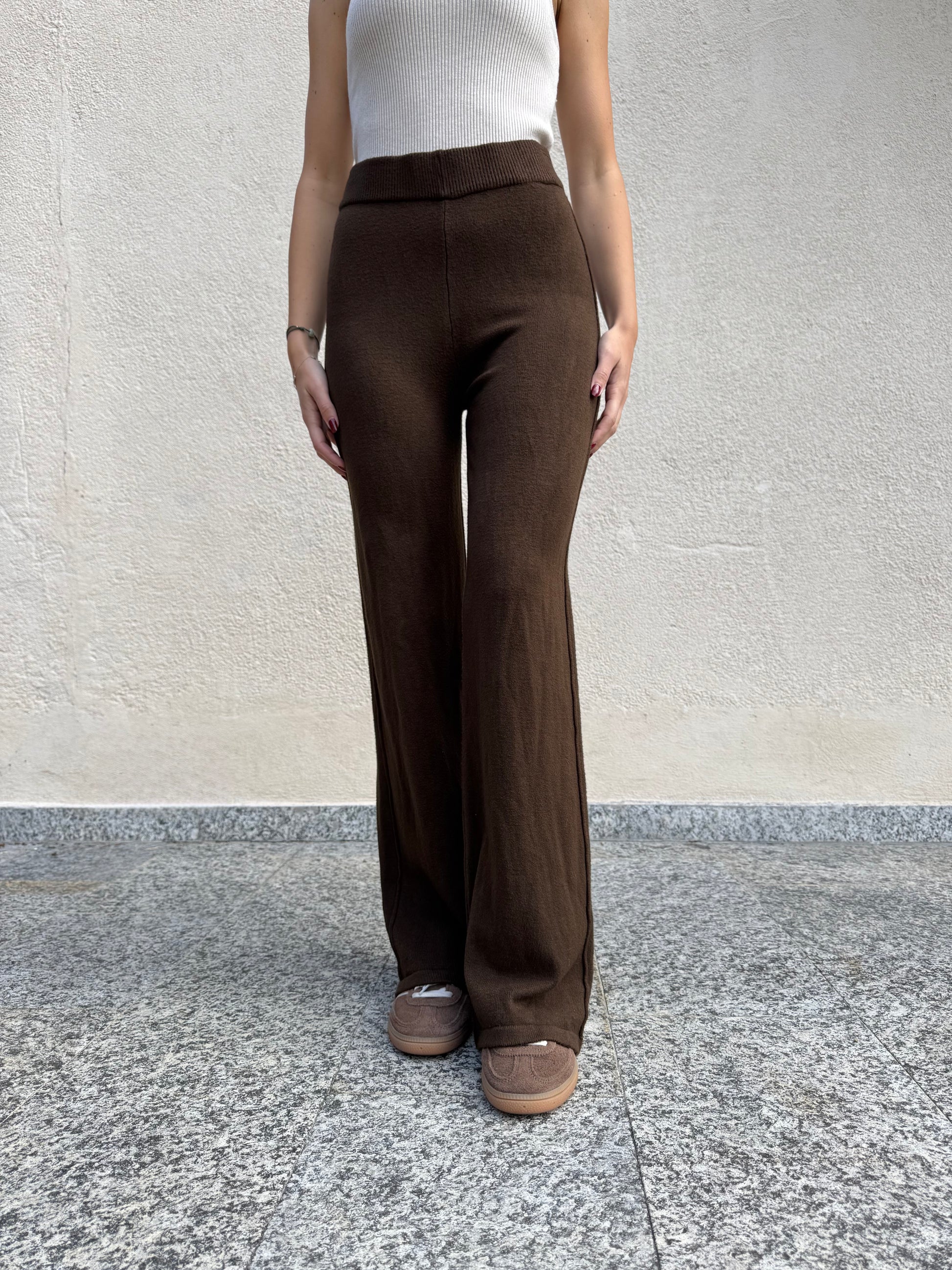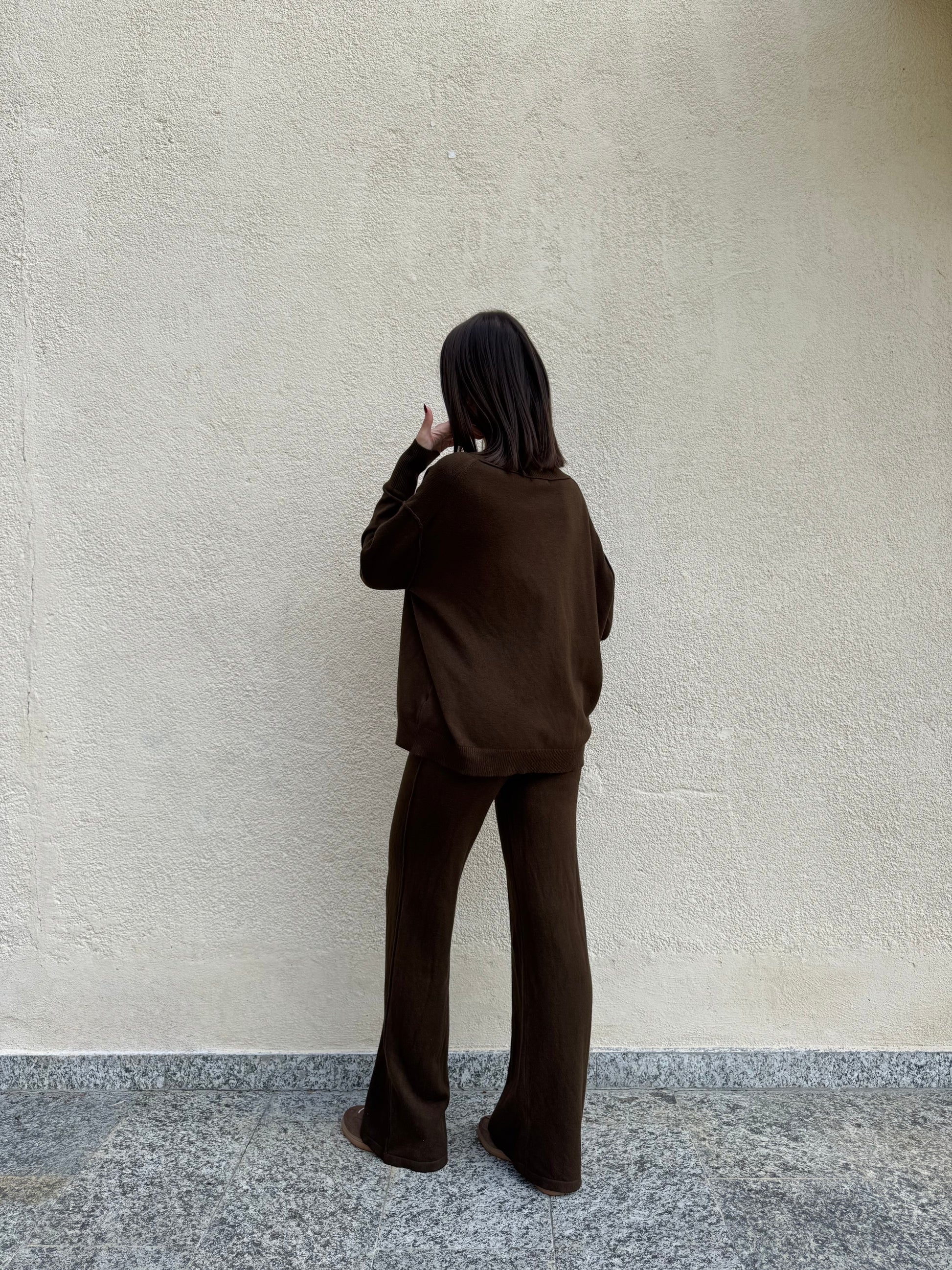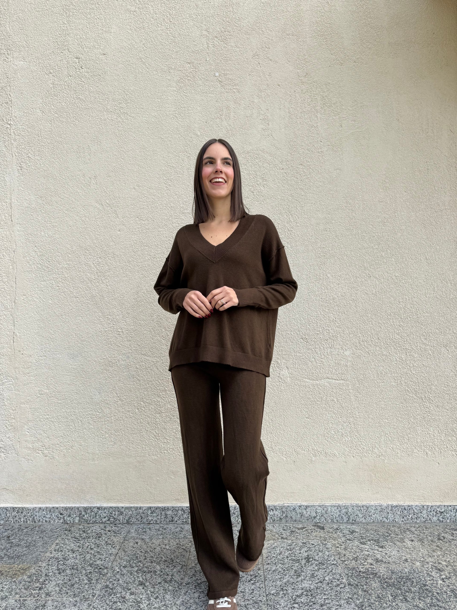 Completo in maglia in calda e morbida viscosa, composto da pantalone con elastico in vita fit morbido. Maglia taglio regolare con scollo a v. Impuntura sia su pantalone che maglia in evidenza.