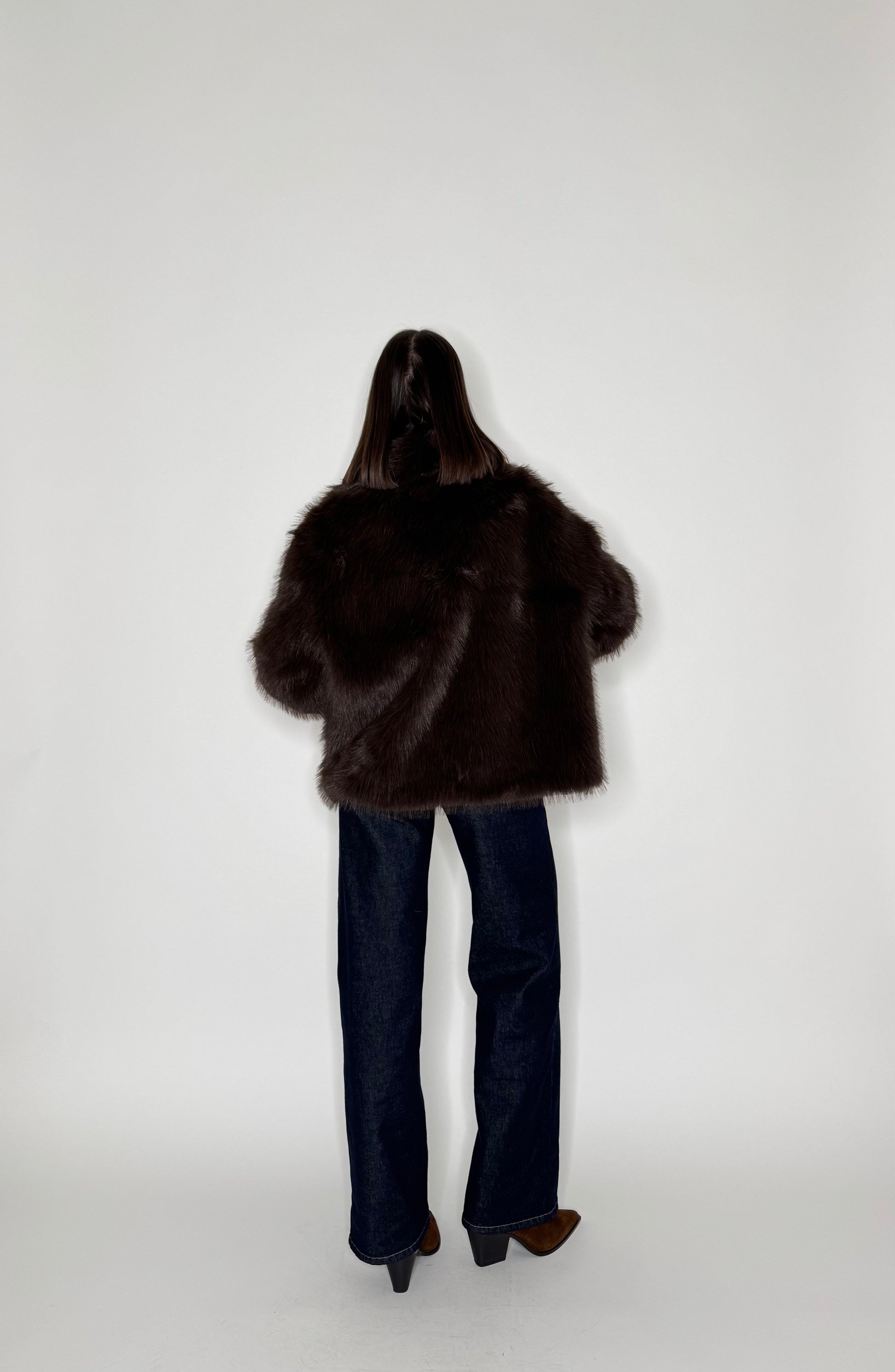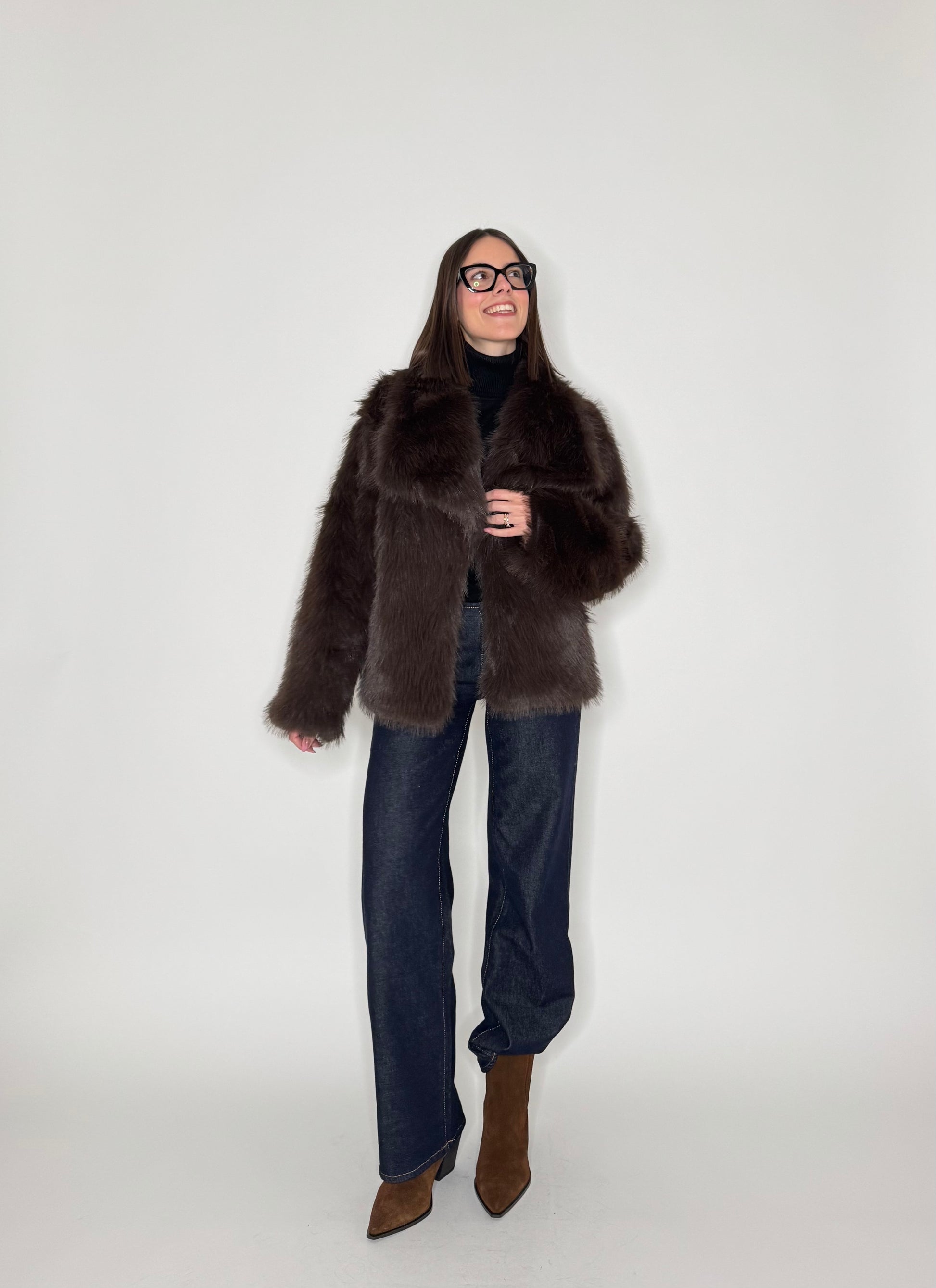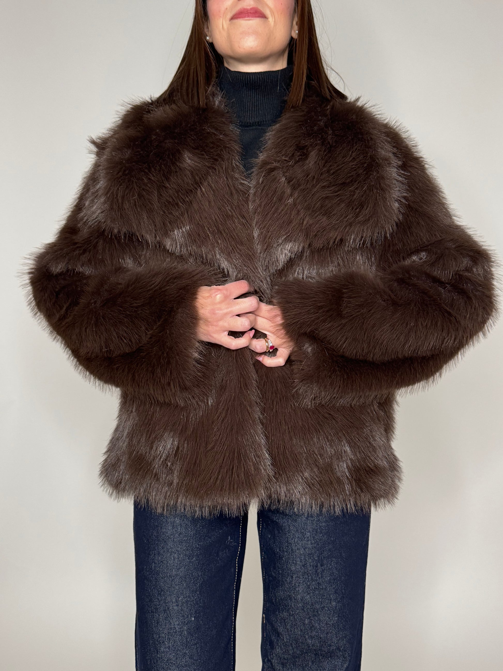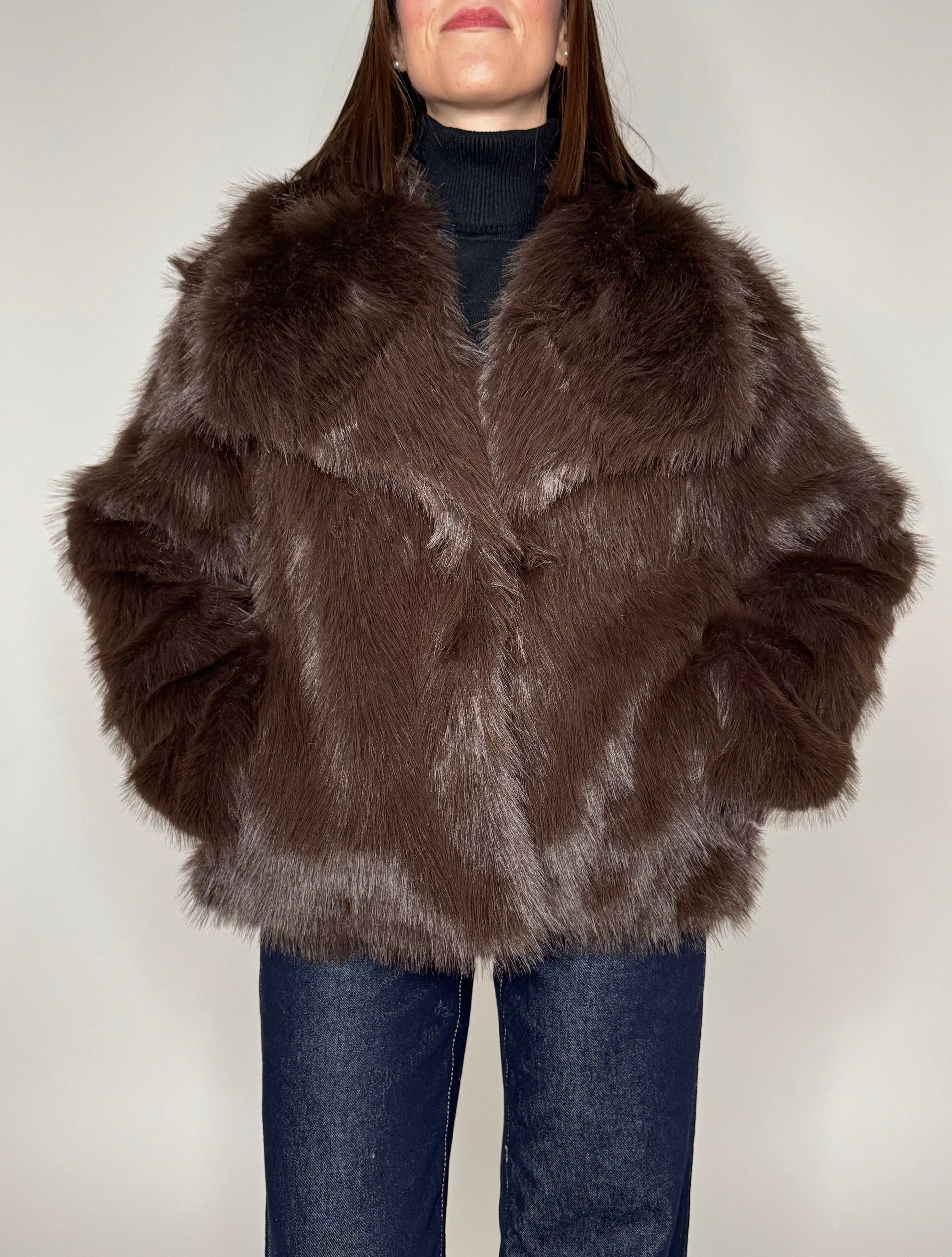 Eco pelliccia in color moro, collo importante, spalle scese, tasche laterali a filo, foderata, 2 bottoni centrali automatici per chiusura.