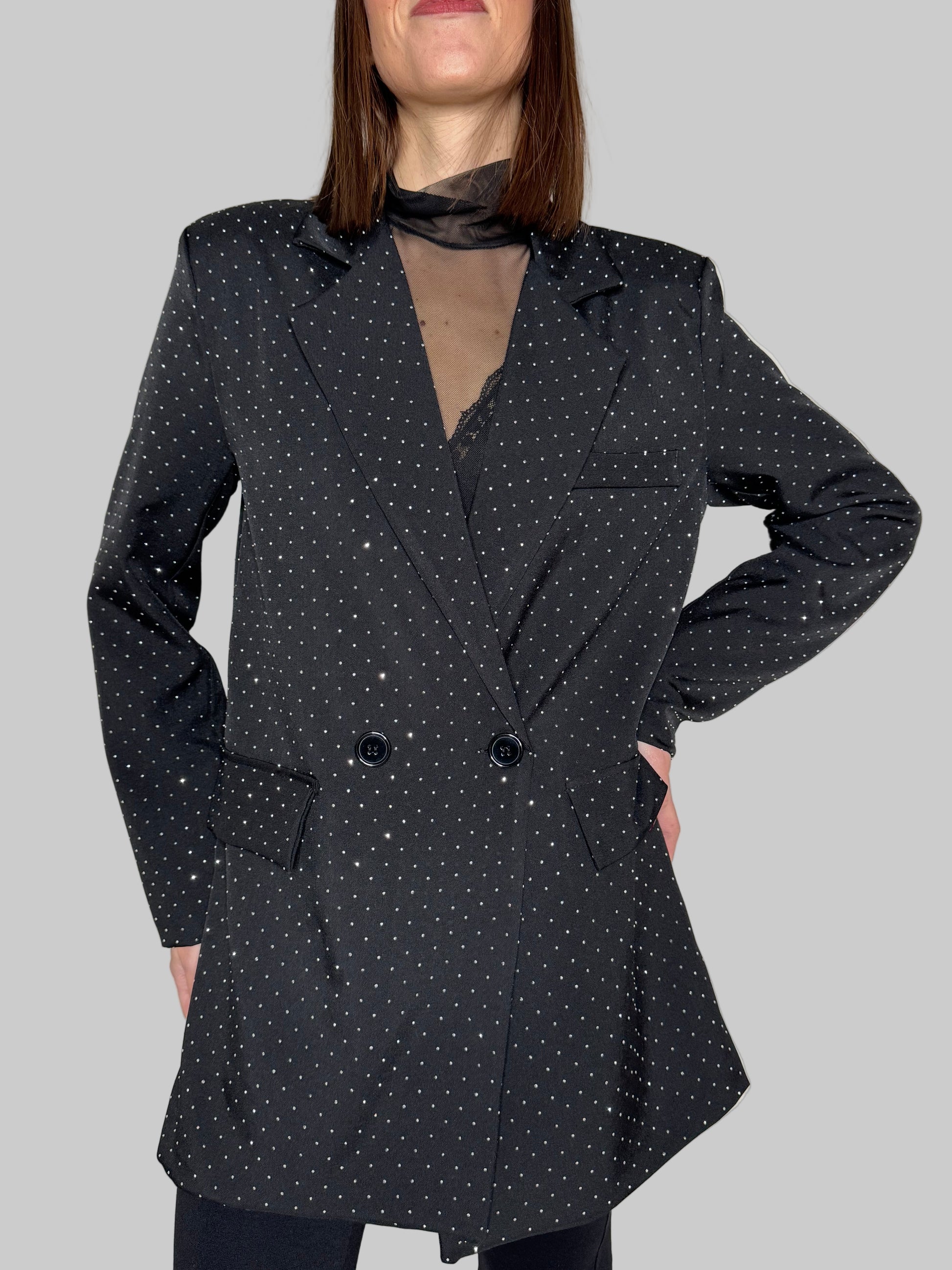 Giacca doppio petto, strutturata, spalle imbottite, foderata. Tempestata di strass. Made in Italy