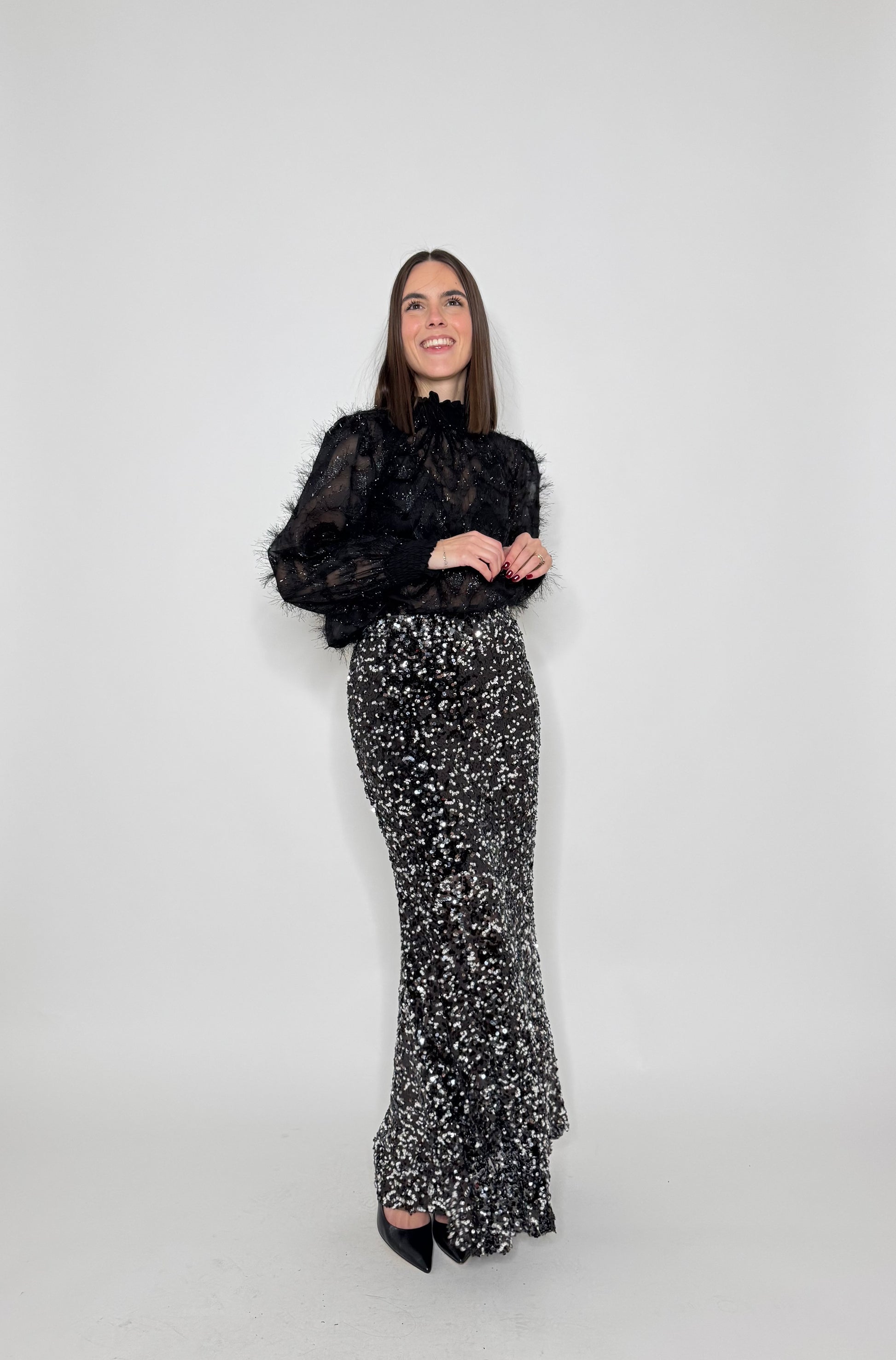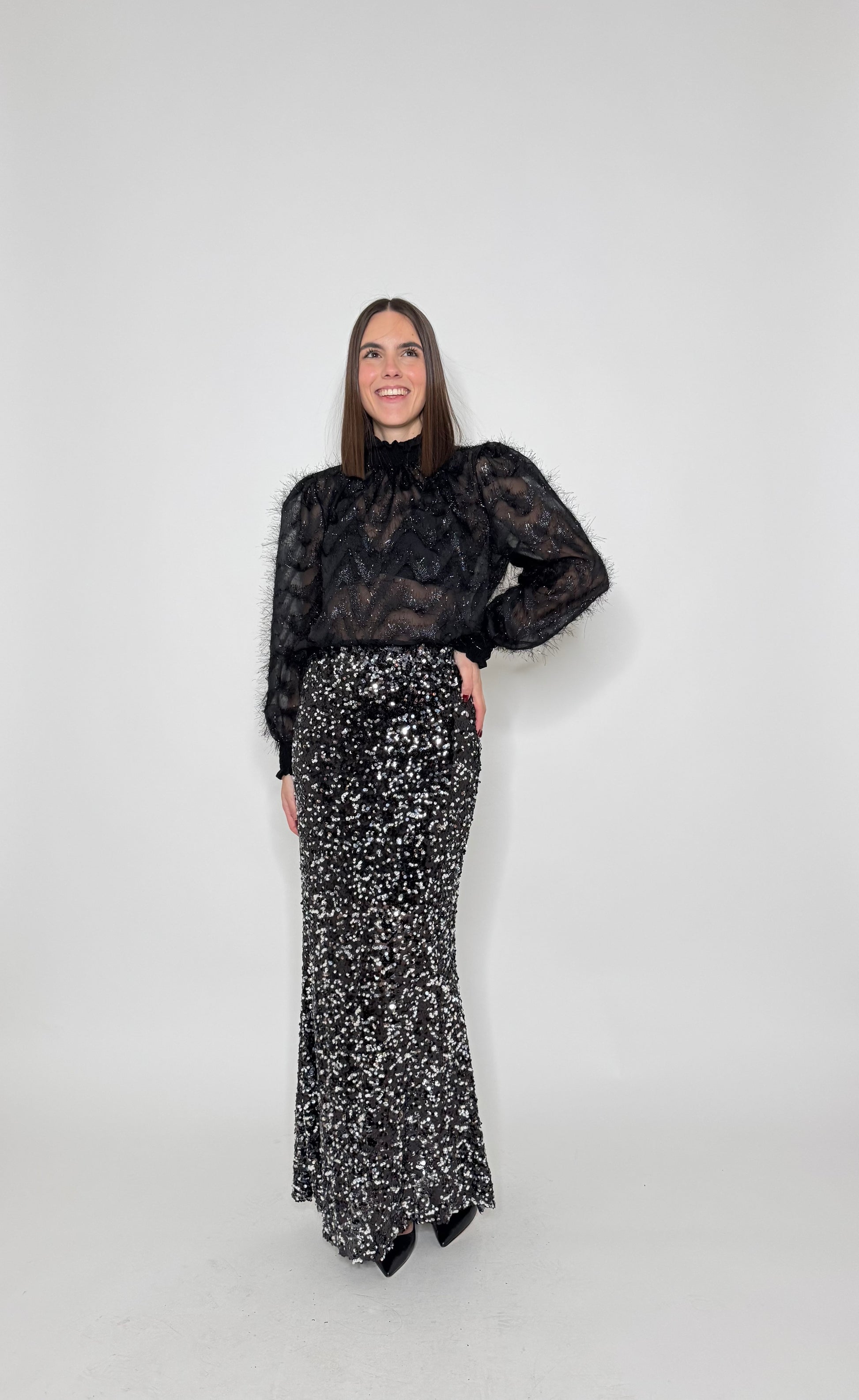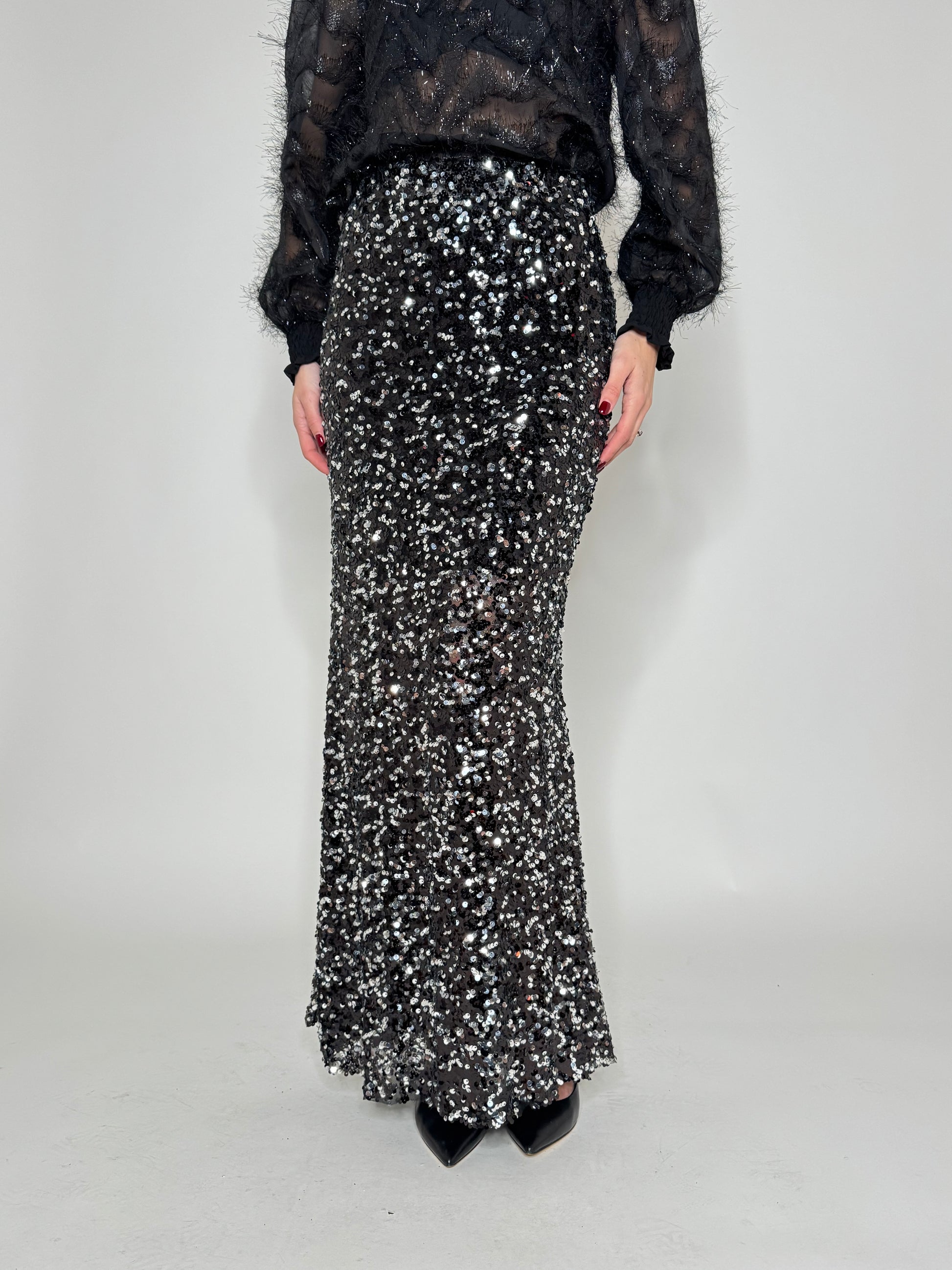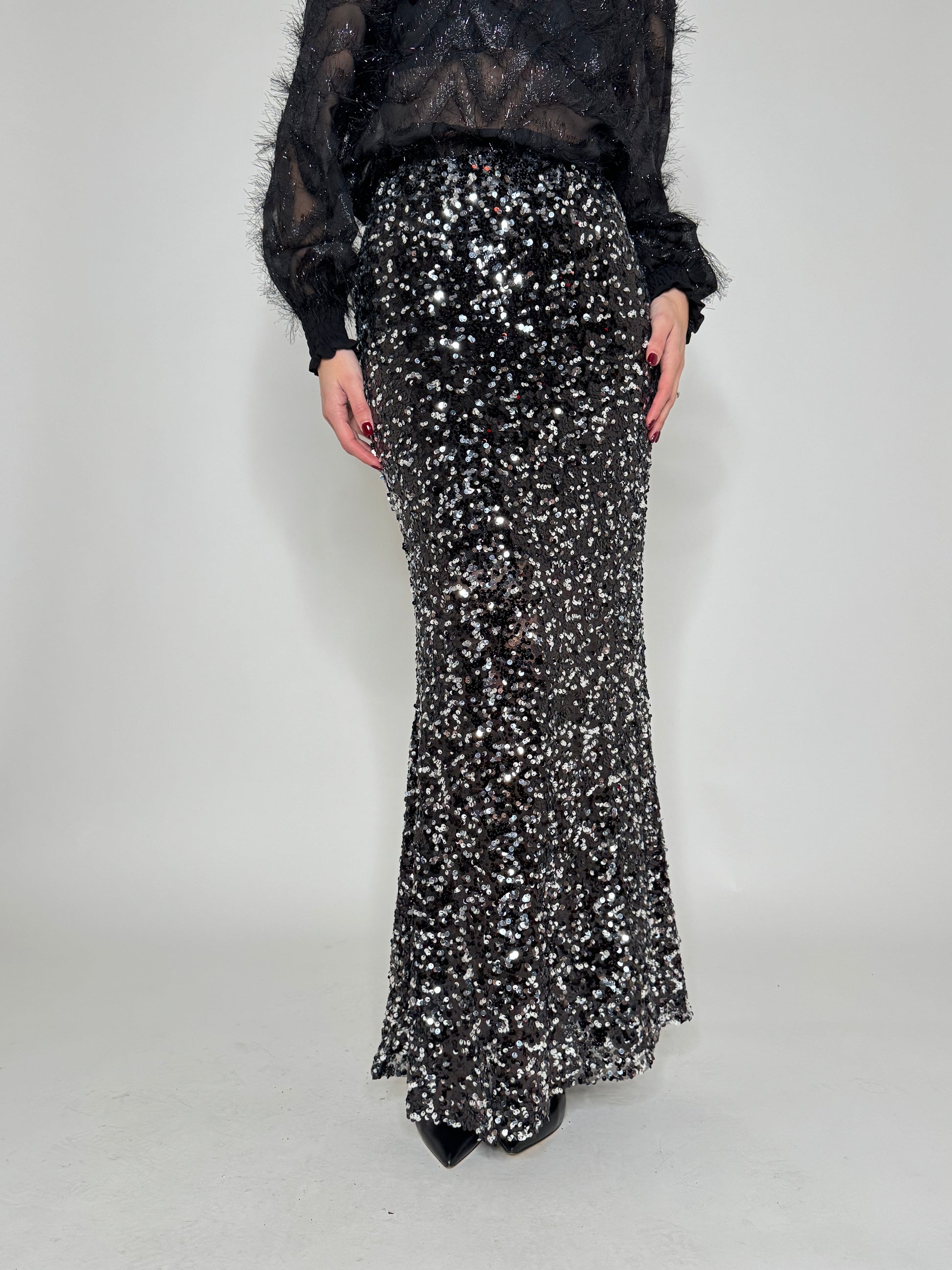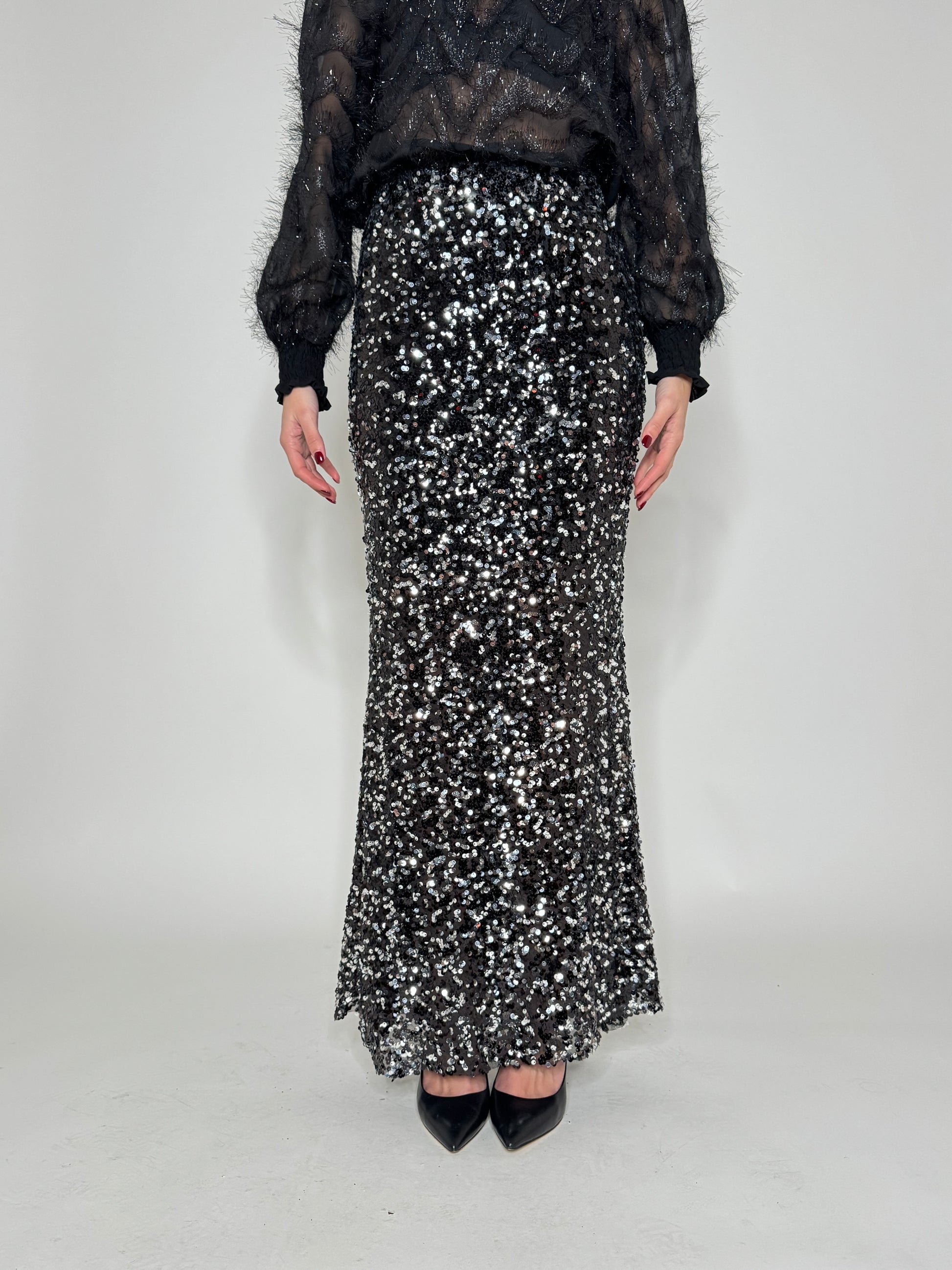 Gonna lunga elasticizzata tempestata da pailletes. Elastico in vita, foderata.