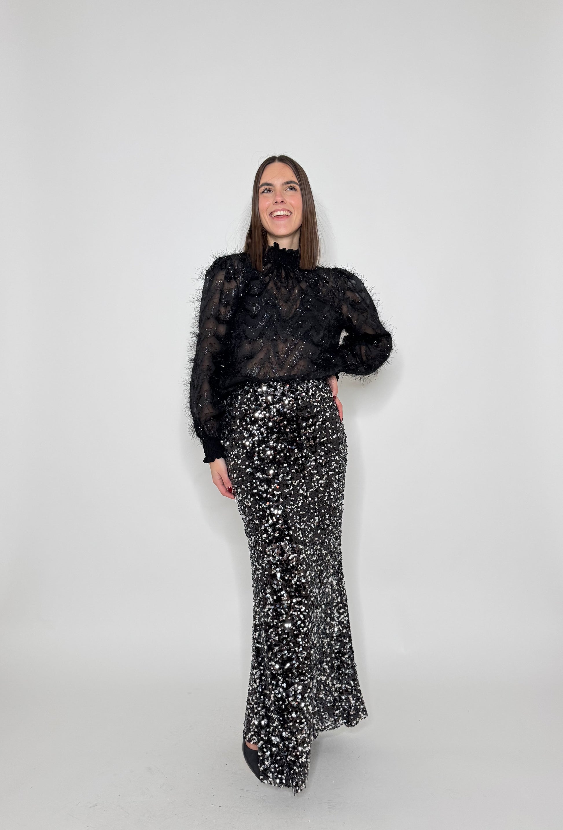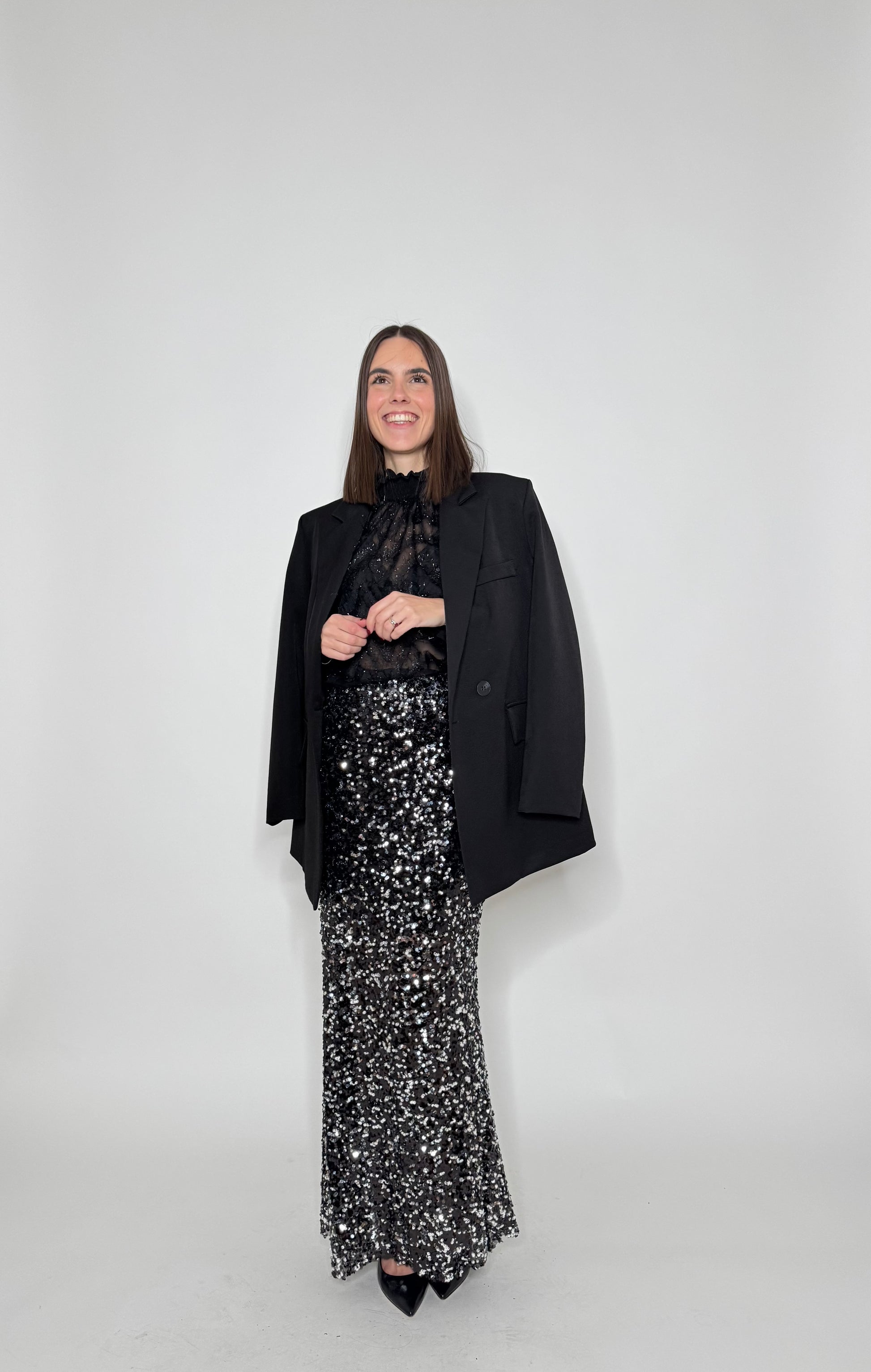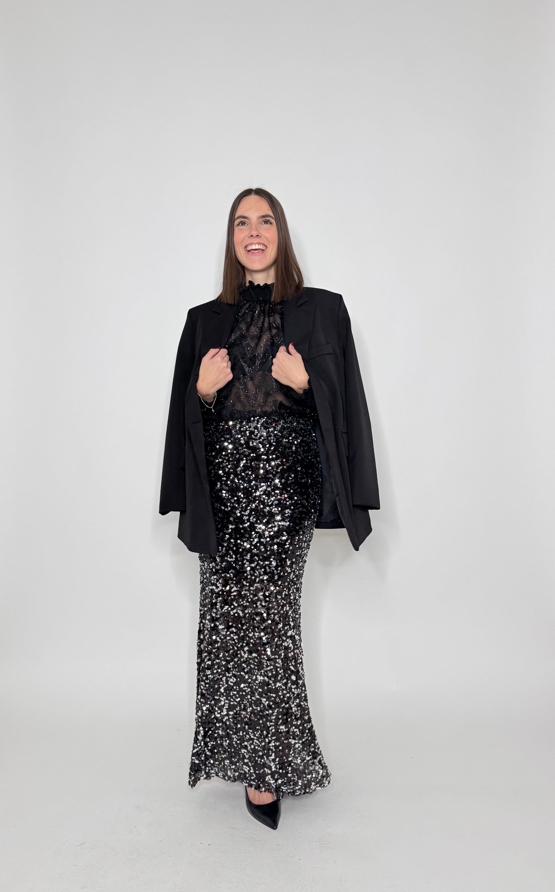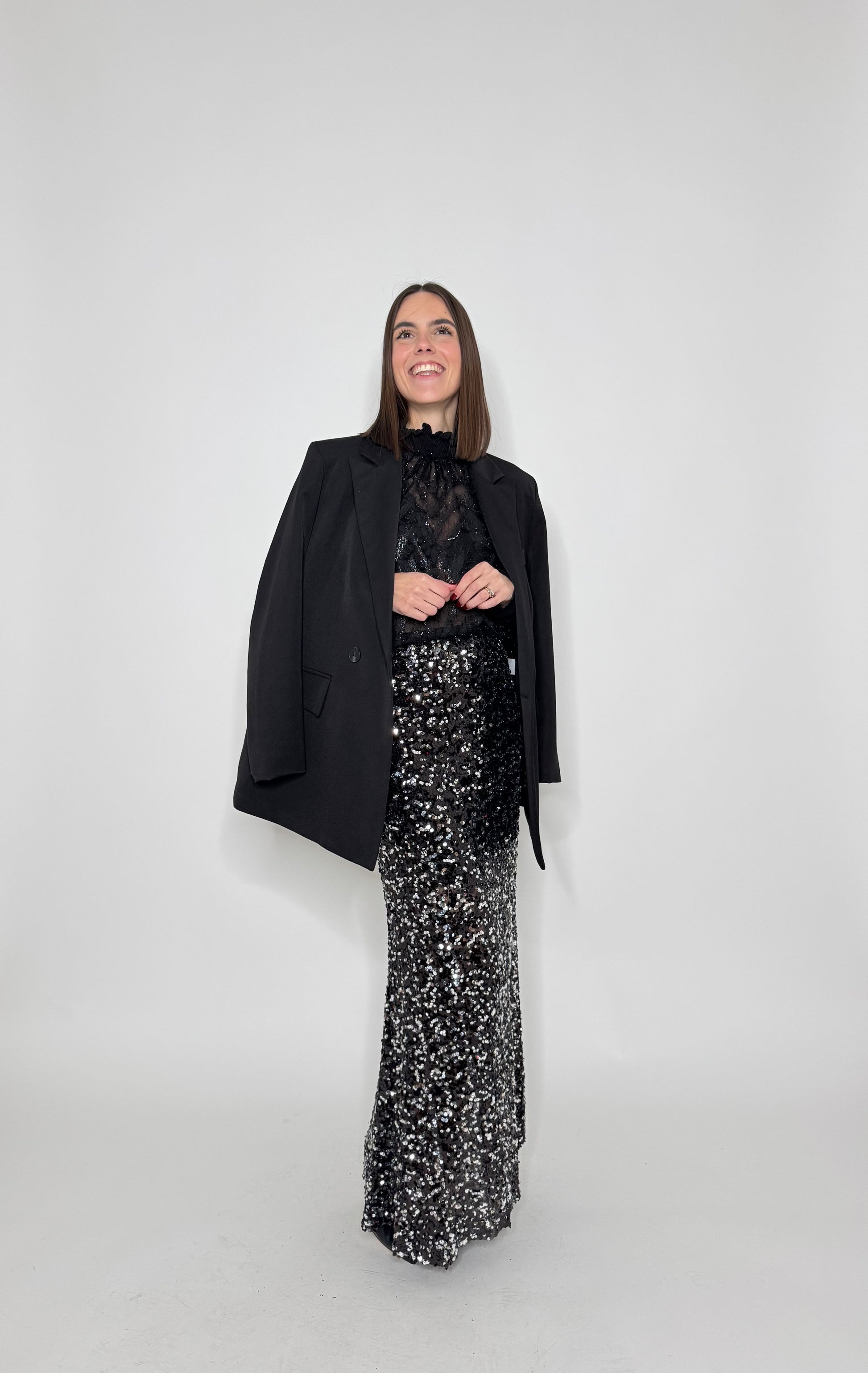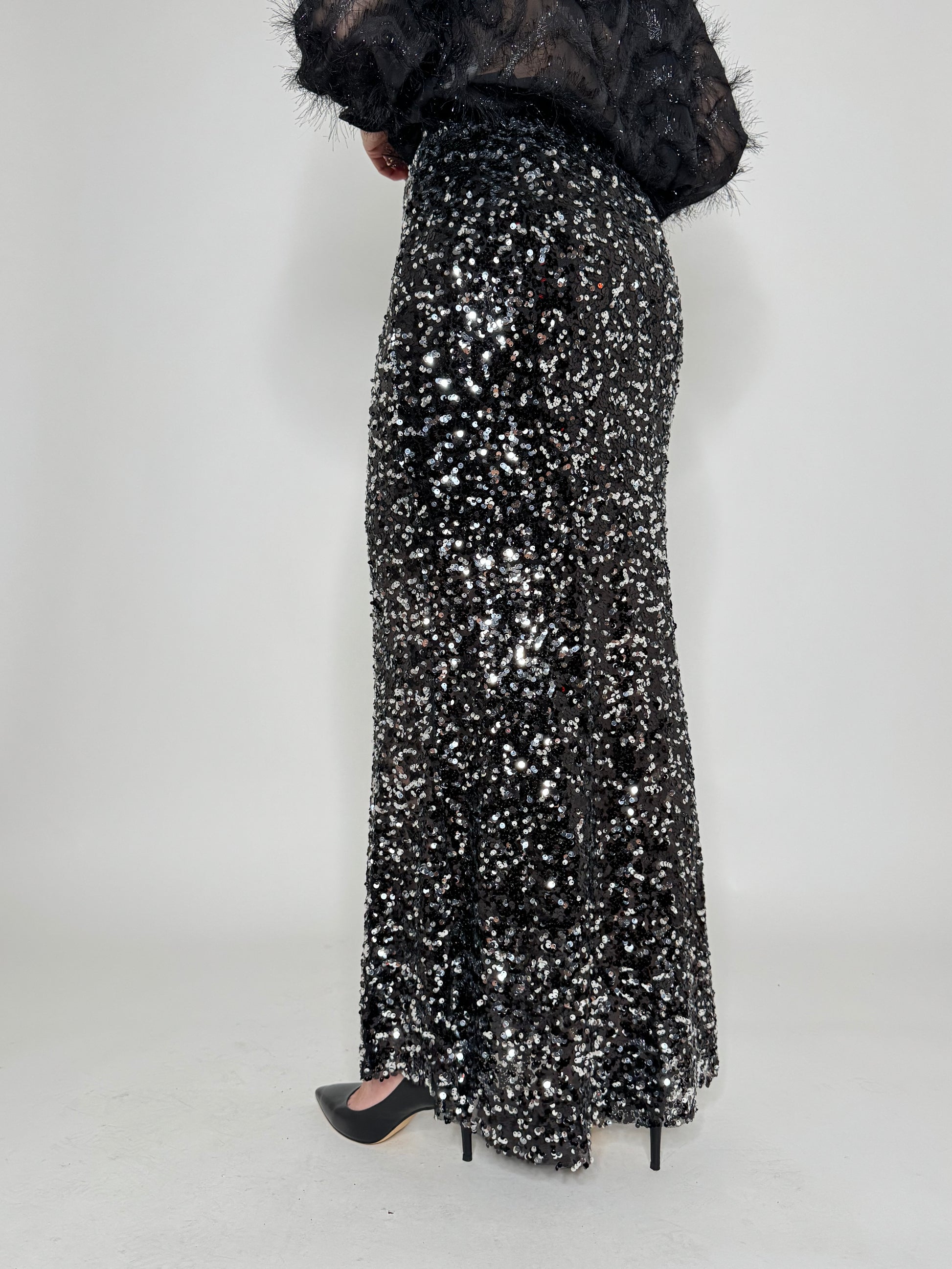 Gonna lunga elasticizzata tempestata da pailletes. Elastico in vita, foderata.