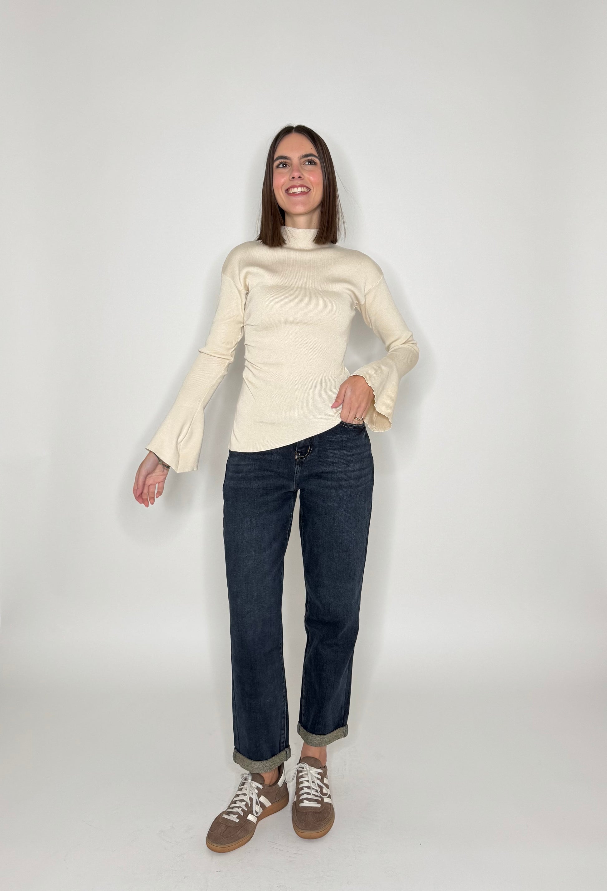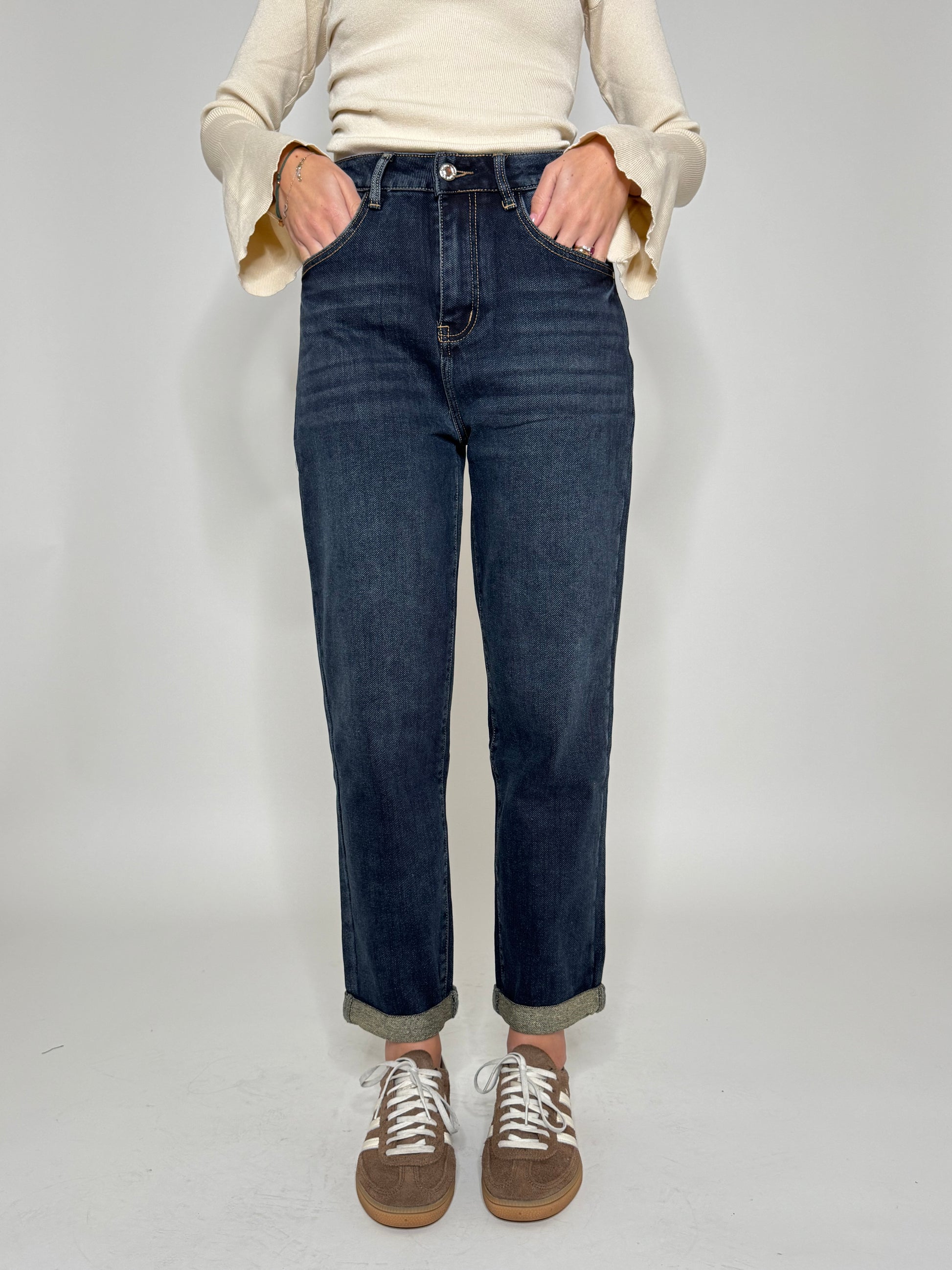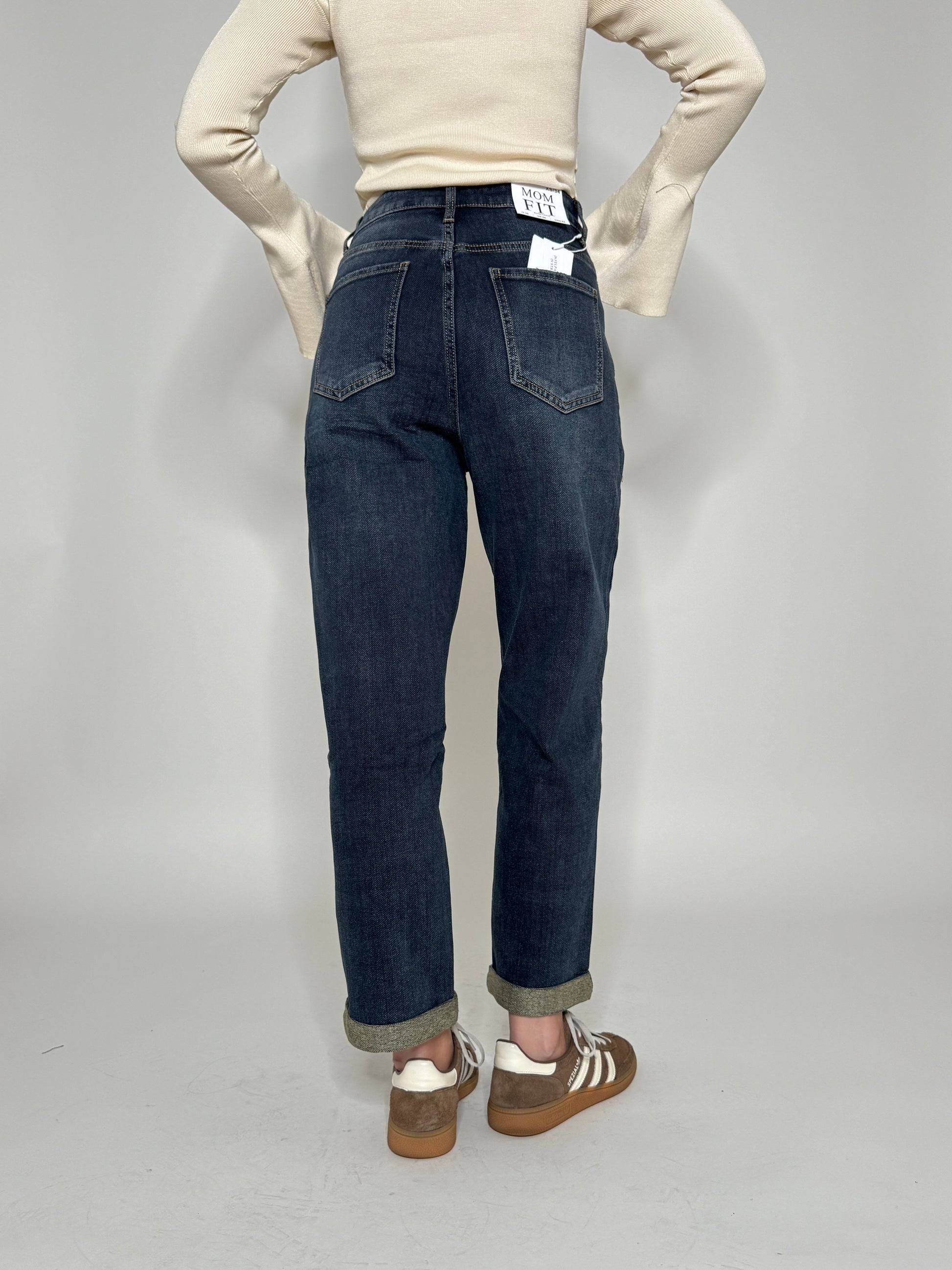 Jeans modello mon fit elasticizzato, colorazione blu denim scuro, tessuto morbido misto viscosa e cotone. VESTONO GRANDI!