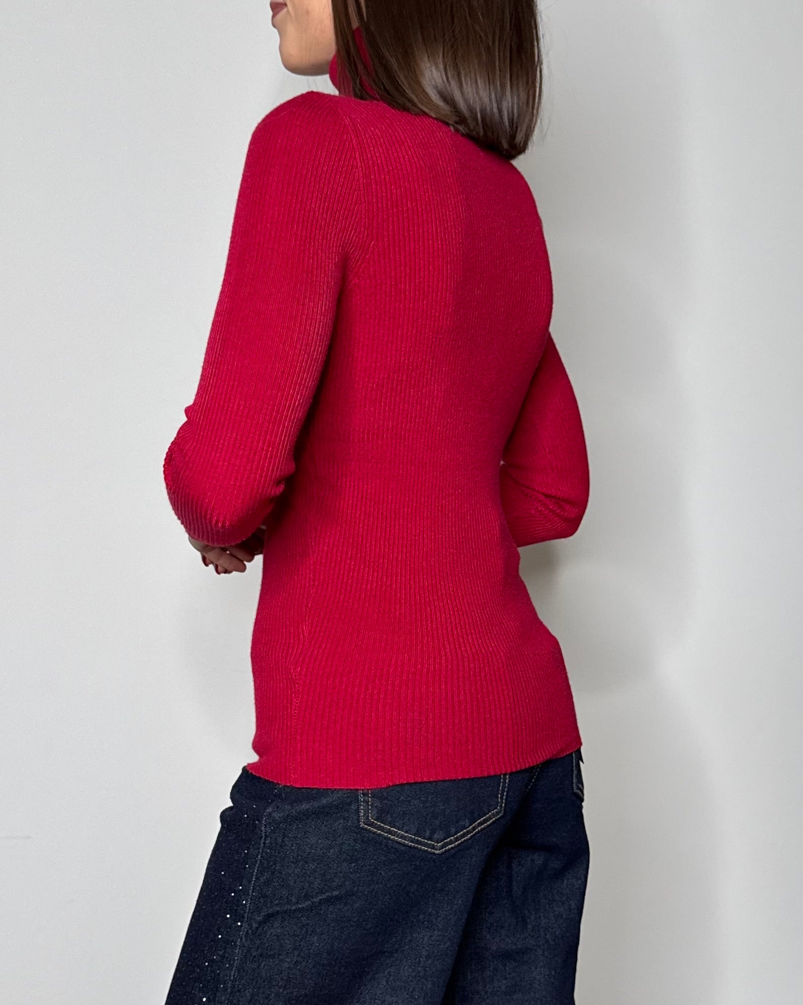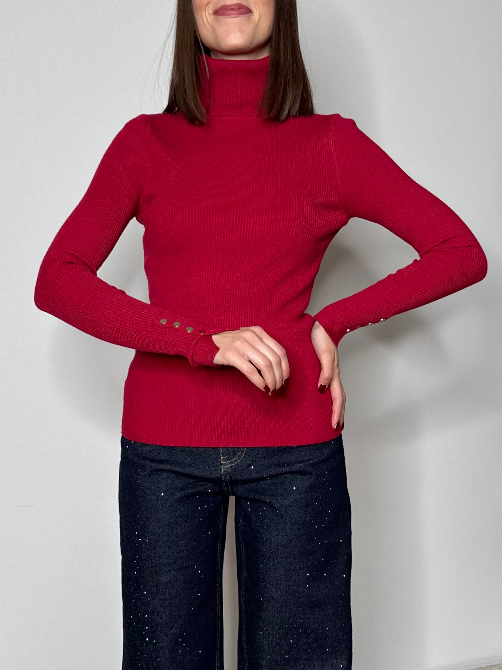 Maglia dolcevita in calda viscosa a costine. Dettaglio di bottoncini in oro sui polsi e spacchetto.