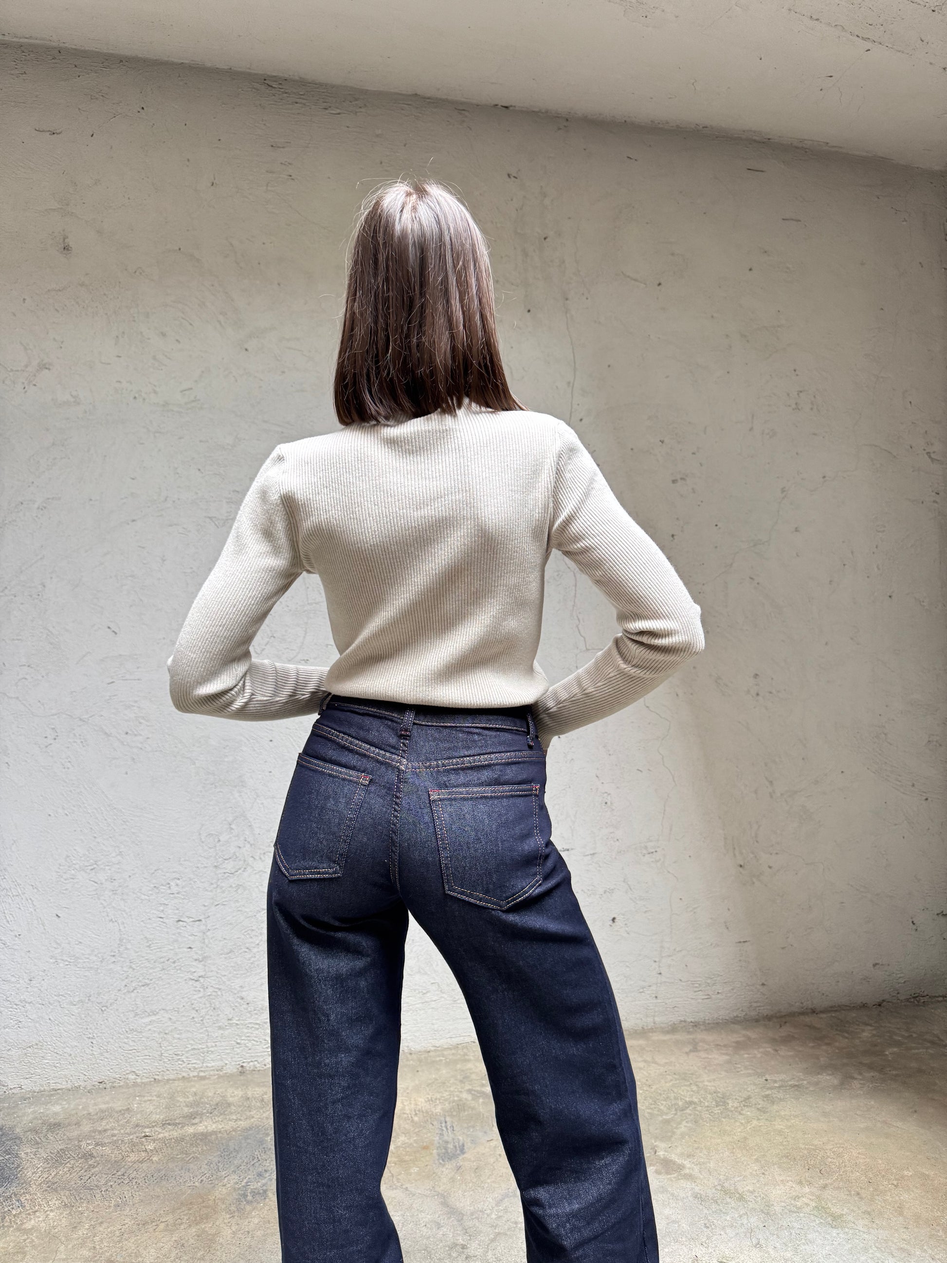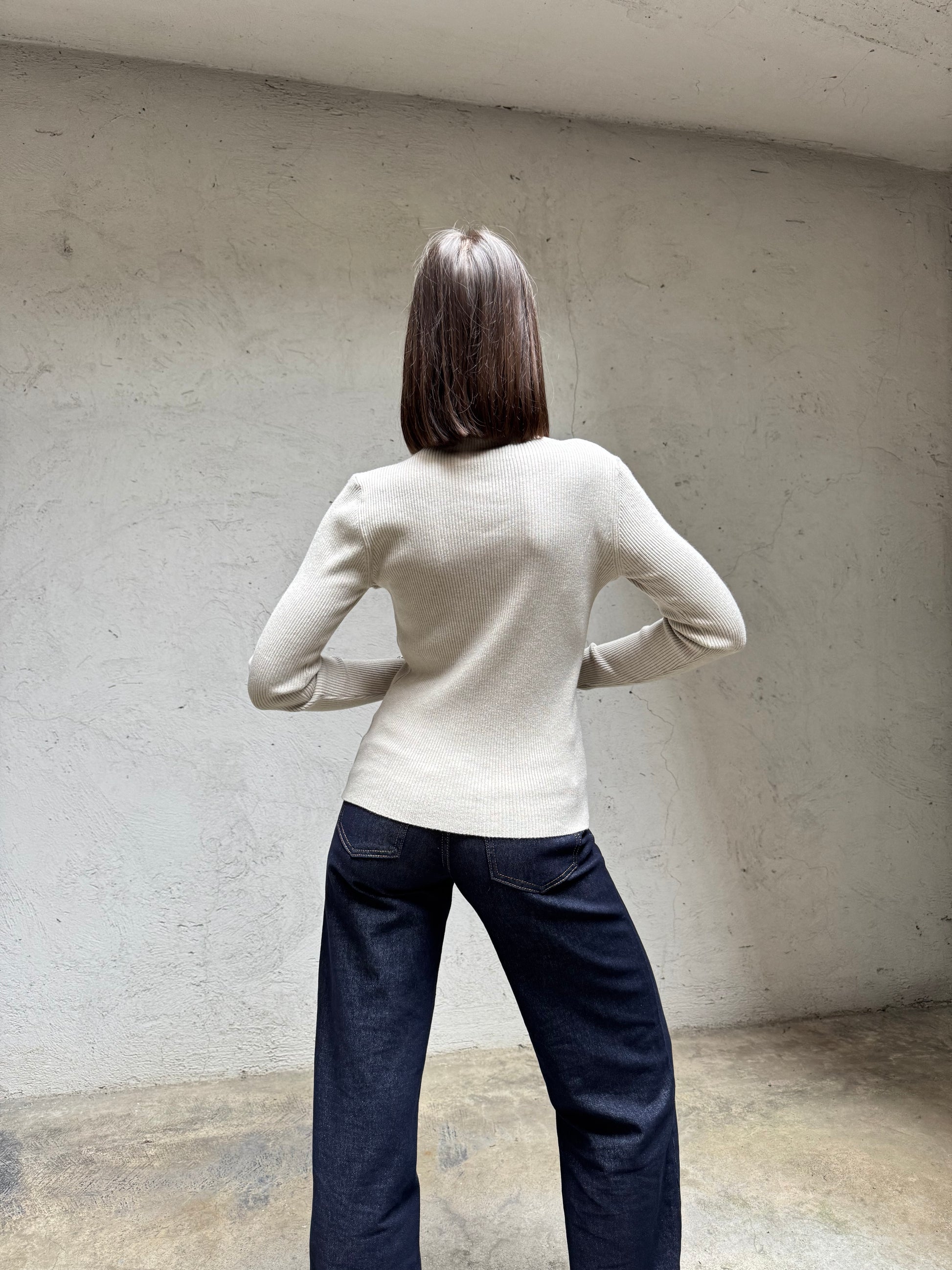 Maglioncino mezzo collo in calda viscosa a costine con aperture cut out, particolarità di perle e swarovski applicati.