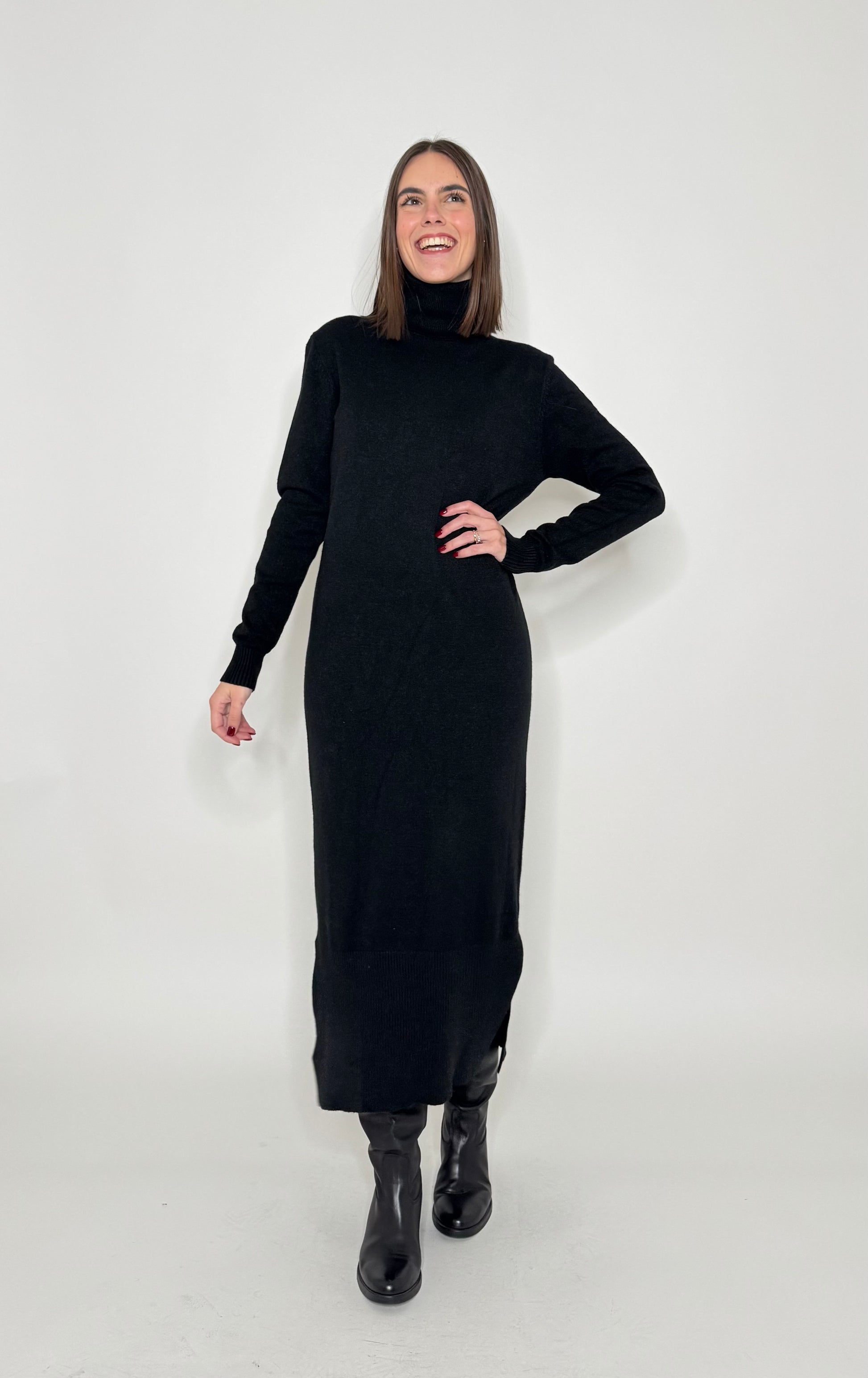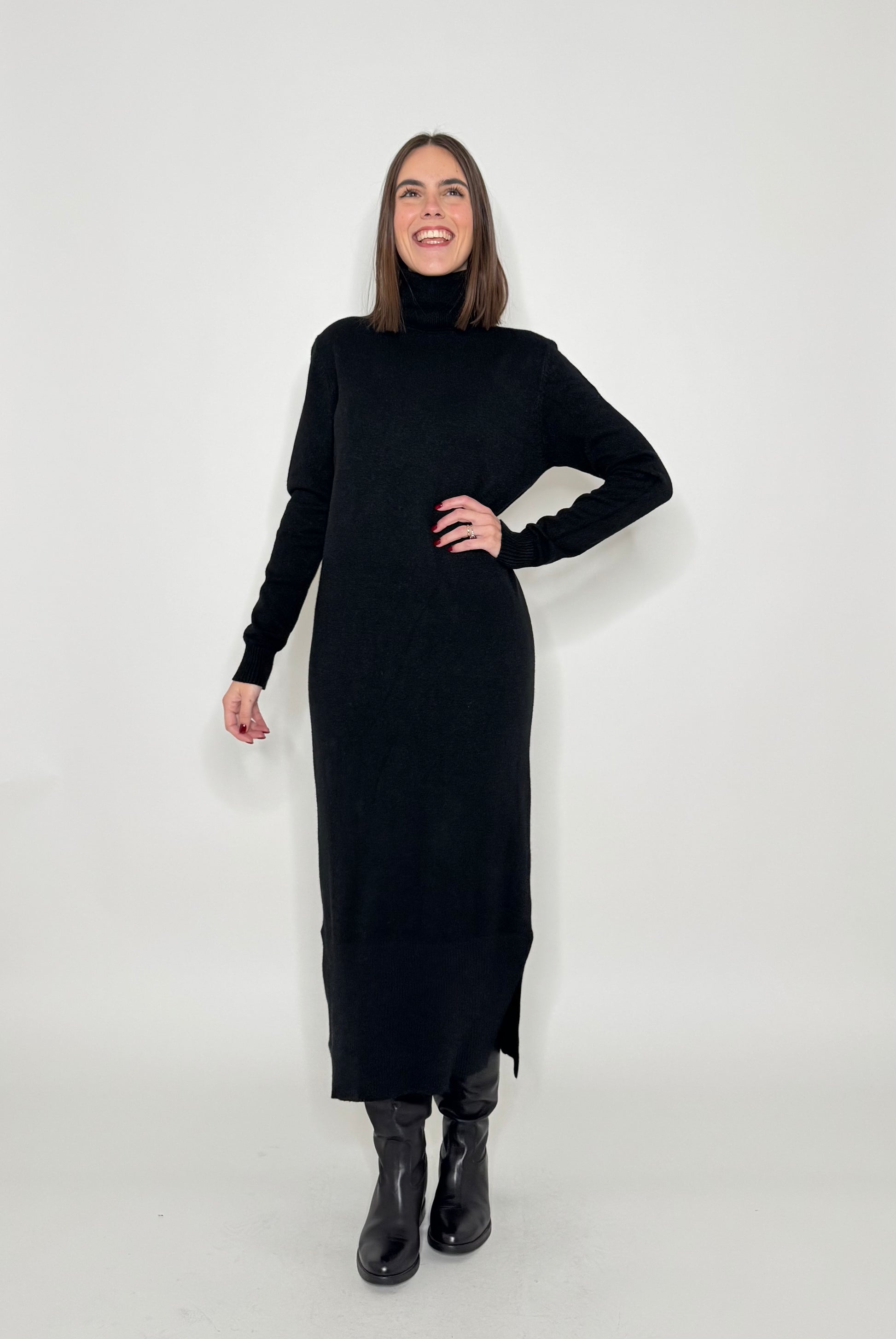 Maxi abito in calda viscosa, dolcevita, spacchi laterali. Modello a scatoletta.