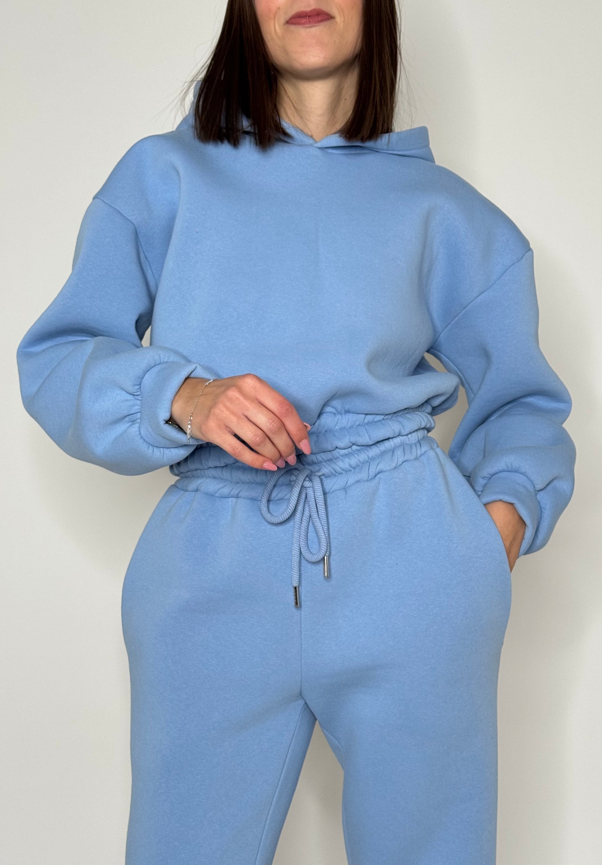 Tuta felpata di cotone pantalone con elastico in vita e polsini. Tasche laterali. Felpa crop e cappuccio.